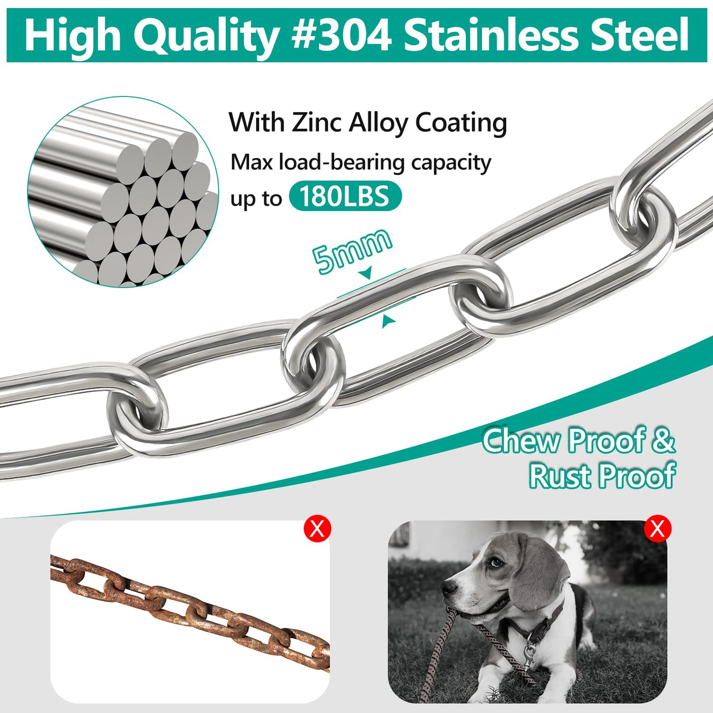 Tresbro Heavy Duty Dog Chains For Outside, 10Ft Stainless Steel Tie Out Cable With Swivel Hook For Large Dogs, Metal Chew Proof
