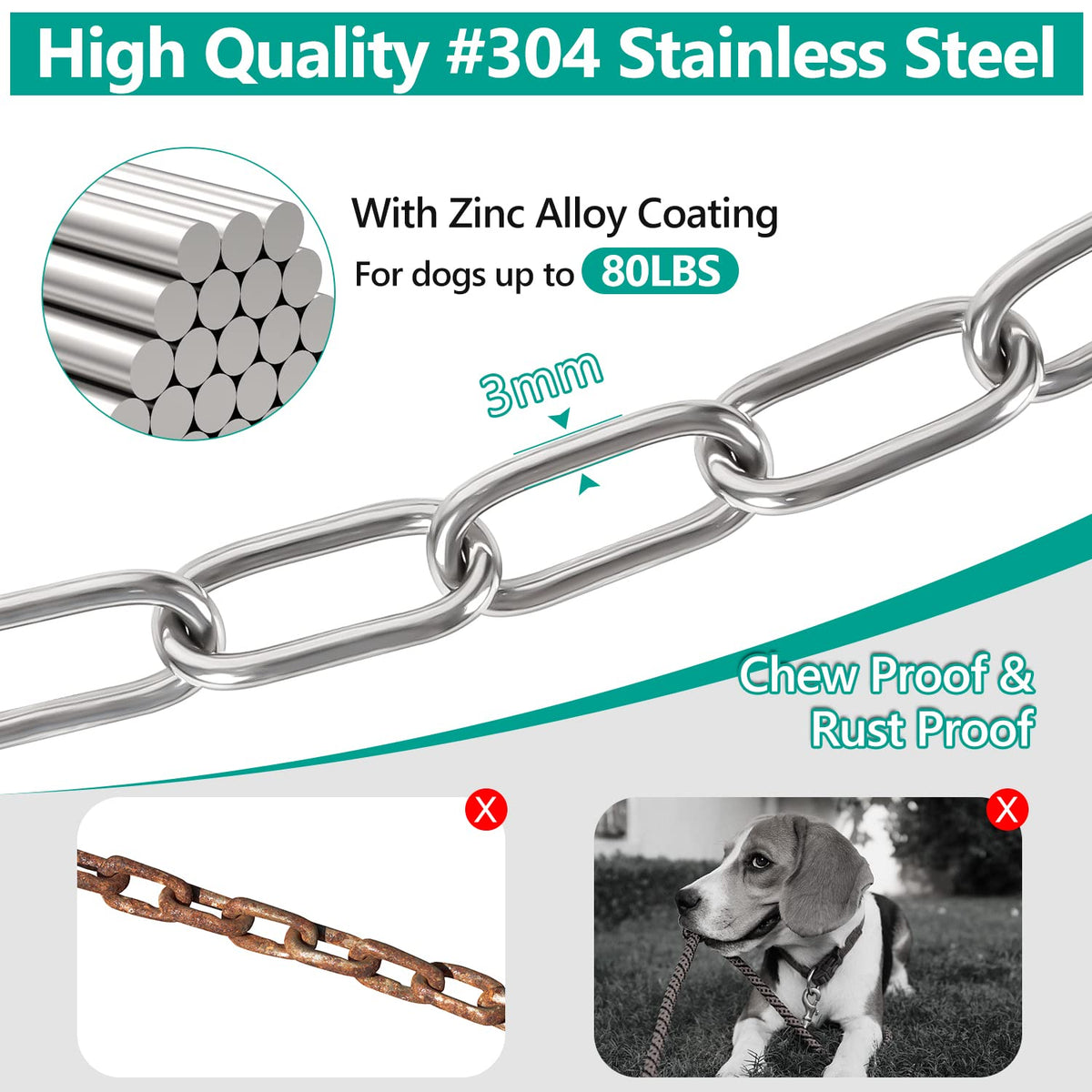 Tresbro Heavy Duty Dog Chains For Outside, 40Ft Stainless Steel Tie Out Cable With Swivel Hook For Small Medium Dogs, Metal Chew