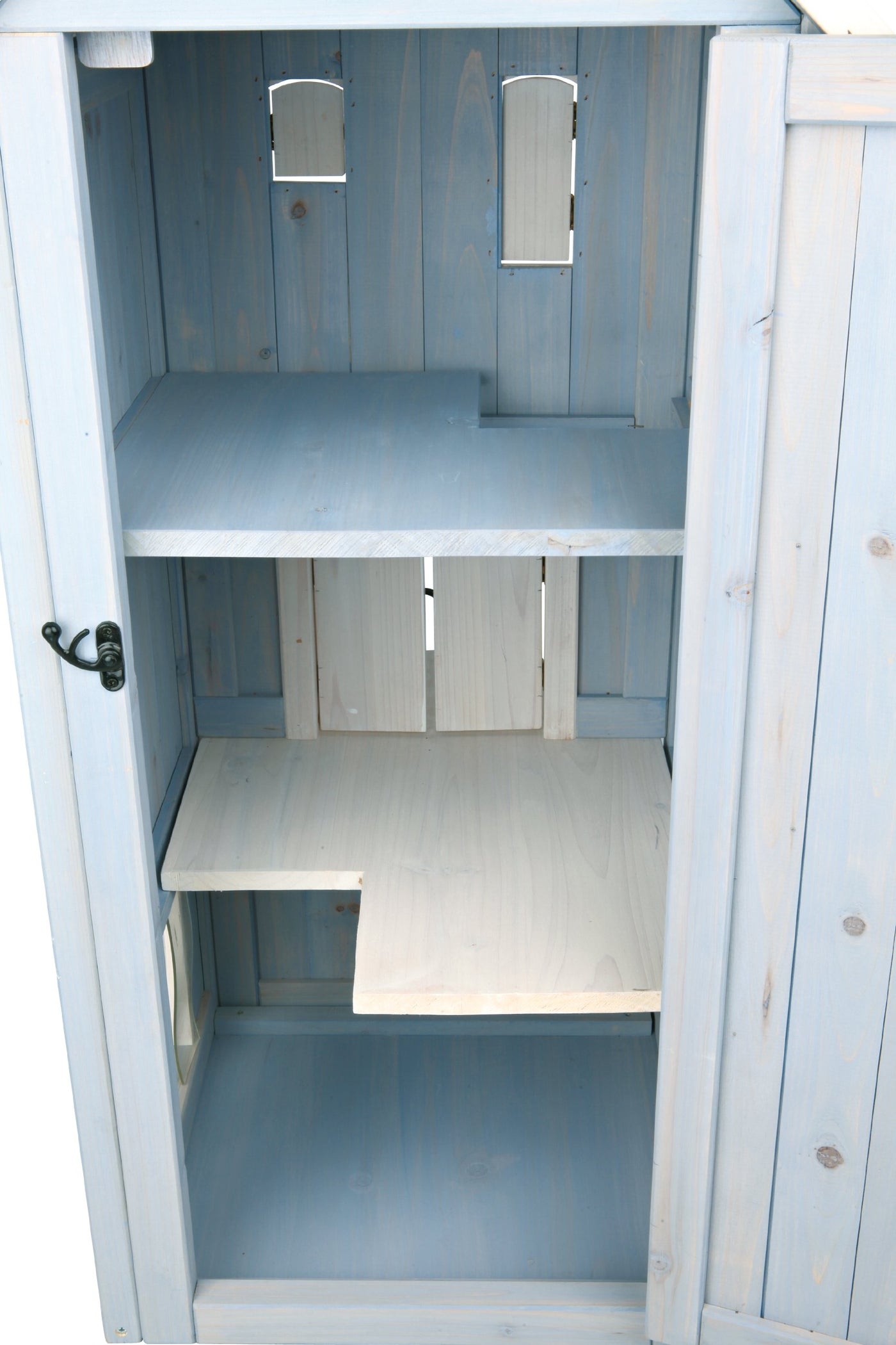 Trixies 3-Story Cats Home provides your feline with a secure and relaxed environment that can be used both indoors and out. Being crafted with solid pine construction, durable composite shingles, weatherproof finish and the finest materials means this cat house will endure years of use with very little maintenance. Cats can come and go using the front door on the 2nd floor or the side door on the 1st floor which has a slatted plastic flaps to keep out unwanted wind and rain. There is also a large door at the back for quick access and easy maintenance. Once inside, they can climb, crawl, jump and explore between the three levels. The charming latched shutters plus two peek-a-boo holes are sure to entertain even the most playful feline. When its time for a catnap, your kitty can curl up on one of the lounging decks for a nap in the sun. The elevated foundation promotes air circulation and protects your cat from ground chill and wet conditions, while the hard plastic footing prevents decay due to wet soil. Suitable for cats of all ages and activity levels. Quick and easy assembly. Color: sky blue/white. Dimensions: 22 x 23 x 37 Inch. Weight: 30 lbs.