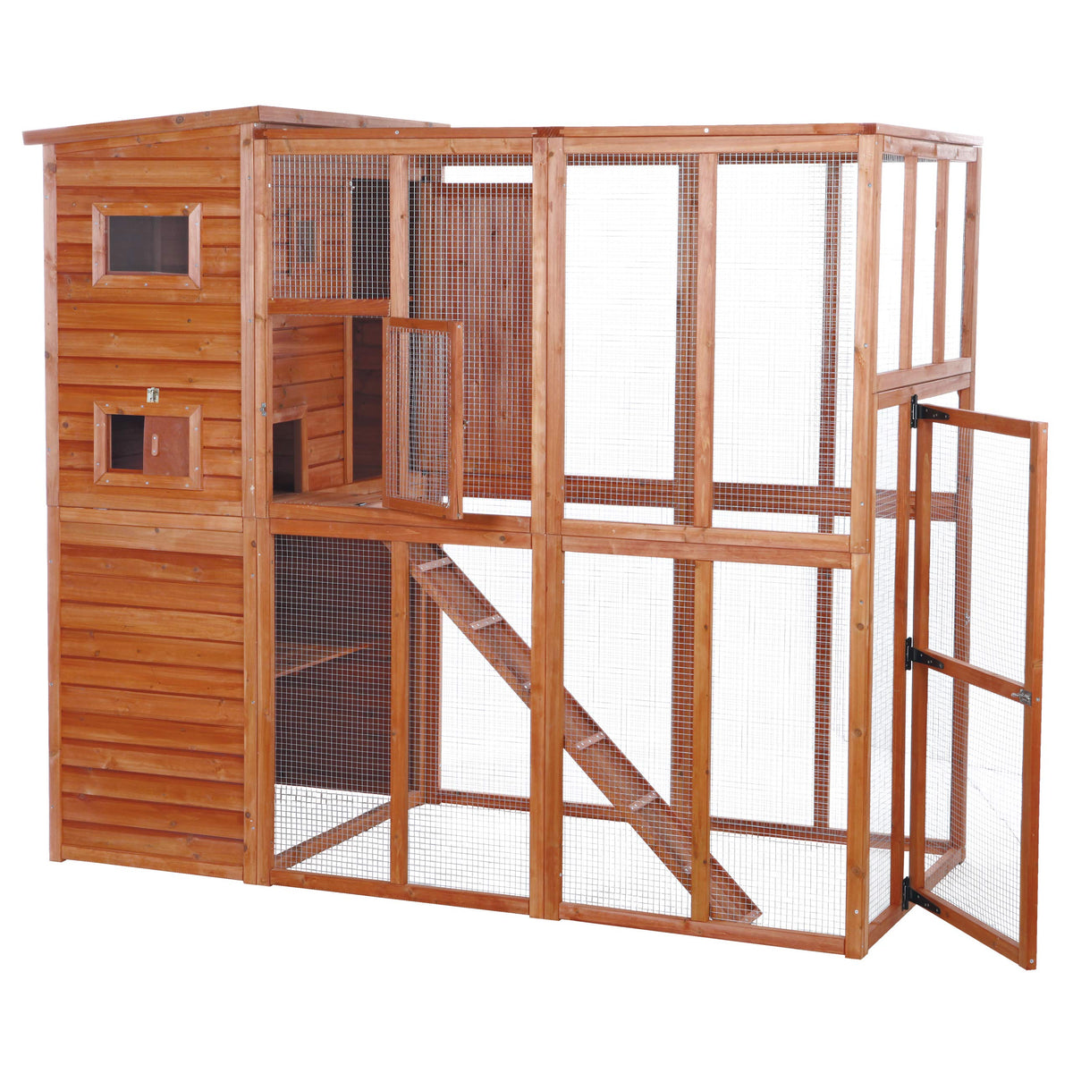 Cats Love Being Outside, And Our Unique Backyard Cat Patio Is Perfect For Housing And Protecting Multiple Cats When Outdoors. Ideal For Multiple Cats, The Two-Story Design Has A Retreat On The Upper Level. The Ramp Allows Your Pet To Roam Freely Inside And Outside, Upstairs And Downstairs, In The Sun Or Shade For Ideal Comfort. Weve Also Included A Window With Pane, Slide Door On The Retreats Exterior, As Well As A Small Side Door With Latch For Easy Access To Your Pet. Wood Paneling At The Back And Side Offer Additional Protection From The Elements. Weve Even Included A Large Front Door With Metal Latch For Security. Suitable For Cats Of All Ages And Activity Levels. One Year Warranty. Color: Glazed Pine. Dimensions (Inches): 76.75 X 37.25 X 68.75; Main Door Opening: 21 X 43; Mesh Side Door: 12 X 12; Retreat Exterior Doors: 9 X 5; Retreat Interior Doors: 4 X 4 / 7 X 7 / 16 X 28; Retreat: 32 Deep. Materials: Weather-Treated Non-Toxic Fir Wood, Composite Asphalt Shingles, Metal.