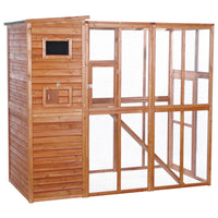 Q: What materials are used in the construction of the cat run?A: The cat run is made from weather-treated non-toxic fir wood, has composite asphalt shingles for roofing, and includes metal components for enhanced durability.