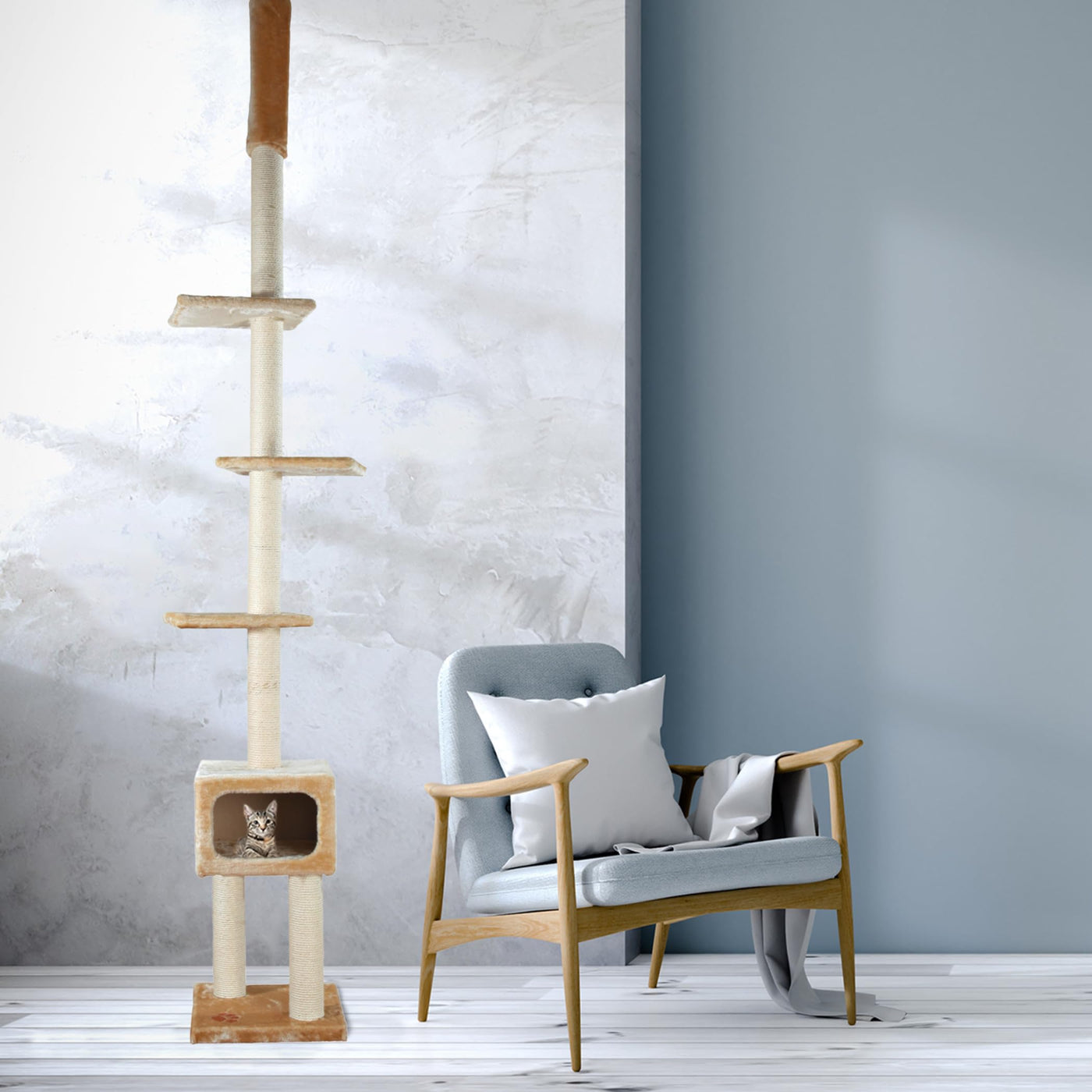 Are You Looking For An Exciting Play Area For Your Furry Feline Friend? Look No Further Than Trixie'S Santander Adjustable Cat Tree - Perfect For Accommodating Multiple Cats. This Floor-To-Ceiling Playground Can Reach 96 To 108 Inches And Is Easy To Install With Our Spring-Activated Ceiling Attachment - No Screws Or Nails Required. With Three Plush Platforms, Your Playful Cat Can Climb And Play To Their Heart'S Content. And For Those Scratching Instincts, There Are Durable Sisal Scratching Posts. When It'S Time To Rest, Your Cat Can Crawl Into The Extra-Padded Kitty Condo Lined With Soft, Plush Material. With Neutral Tones, This Cat Tree Will Fit In Seamlessly With Your Home Decor. Suitable For Cats Of All Ages And Activity Levels, Your Feline Friend Will Love Their New Santander Adjustable Cat Tree. View Translation