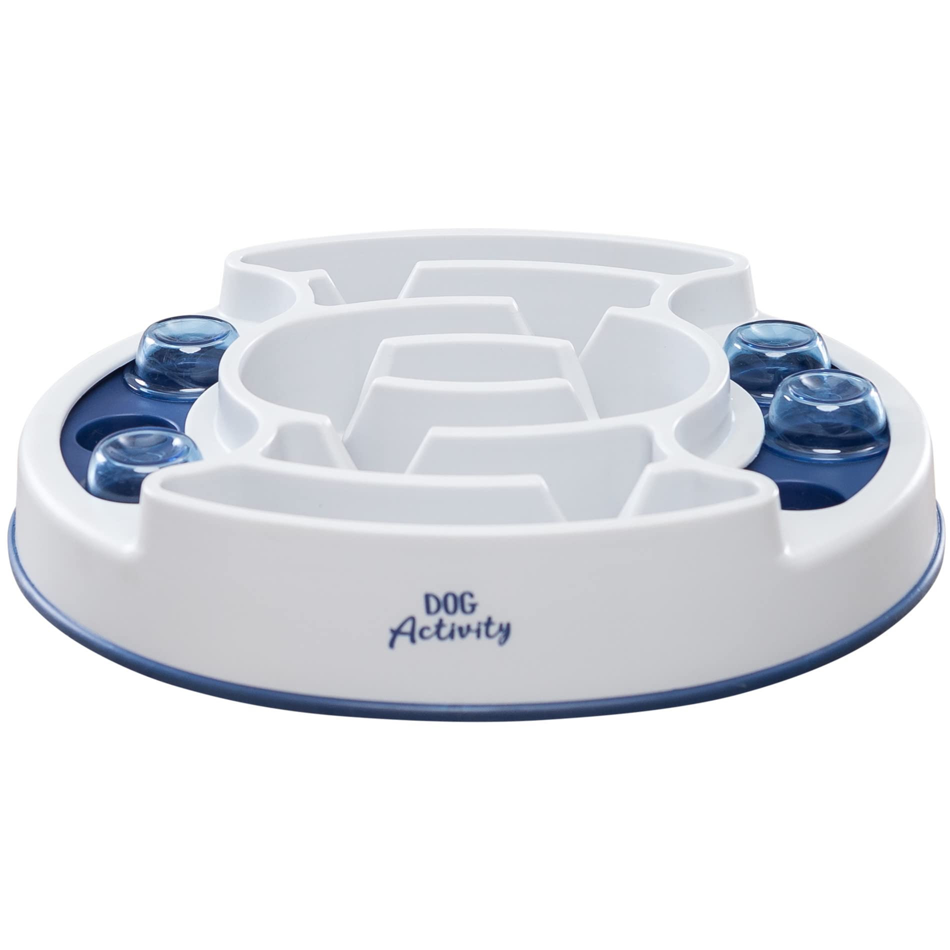 TRIXIE Dog Activity Slide & Feed interactive dog puzzle toy provides fun and mental stimulation It features a slow feeder bowl and six treat-hiding compartments that can be filled with your petAs favorite treats and kibble Your dog will get excited about puzzles The non-slip rubber feet keep the game in place as your dog plays and explores WeAve included an instructional booklet with tips and tricks for challenging and training dogs of all ages through play Suitable for dogs of all ages and activity levels Made from tough plastic parts and pet-safe materials that are BPA and Lead-free Dishwasher safe or hand wash with soap and warm water to clean between uses Your pet should be supervised with this toy