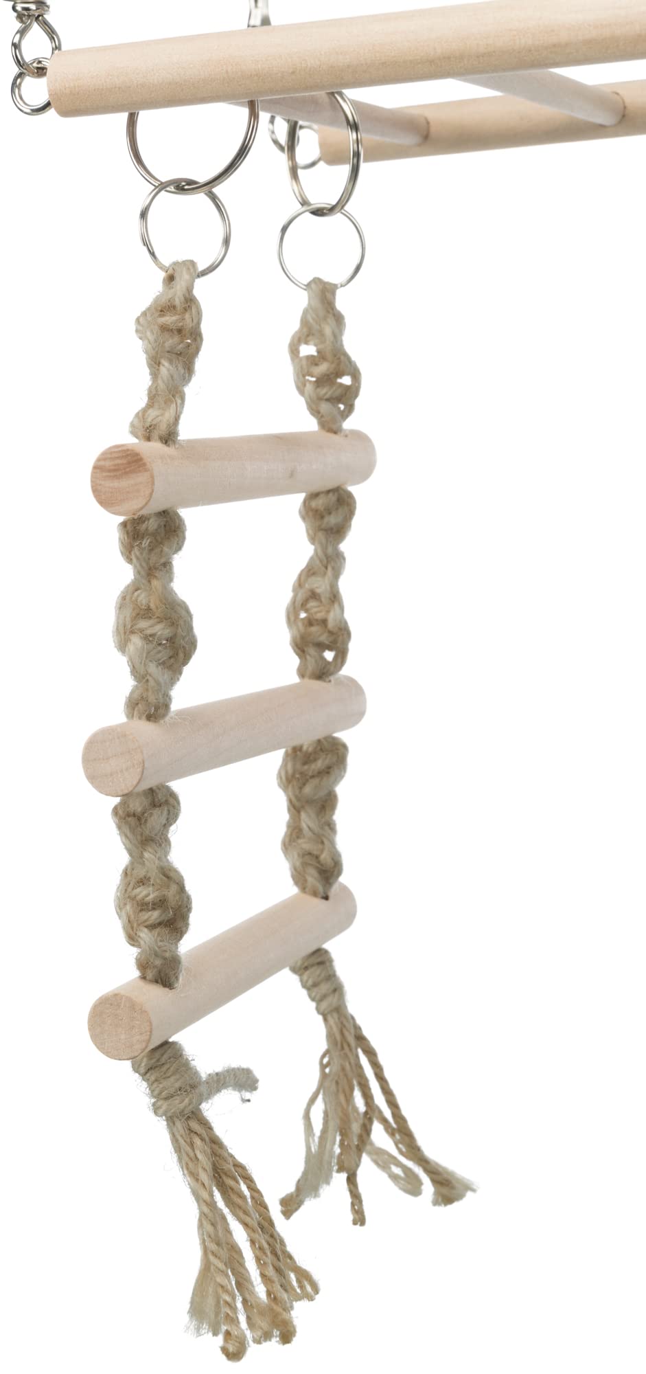 Q: What accessories come with the TRIXIE Suspension Bridge?A: The suspension bridge includes a rope ladder, knotted rope, and a rope ring with a wooden block, providing various options for your pets to play, climb, and chew safely.