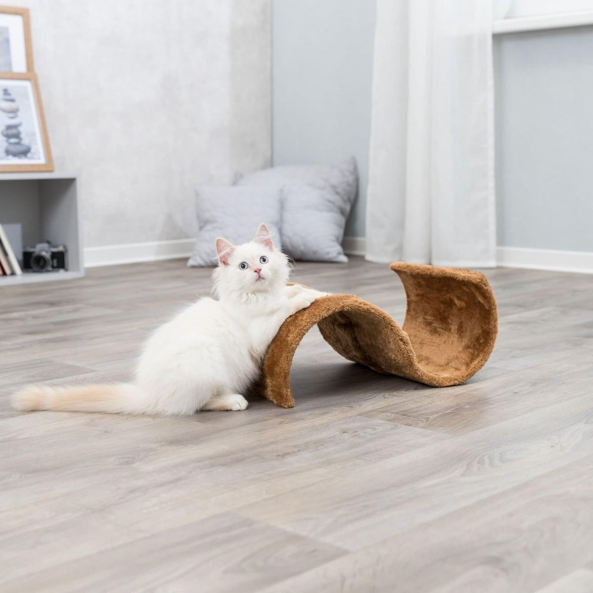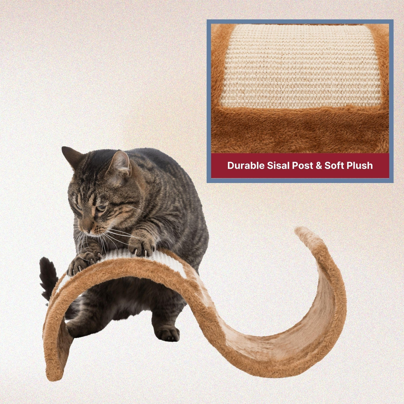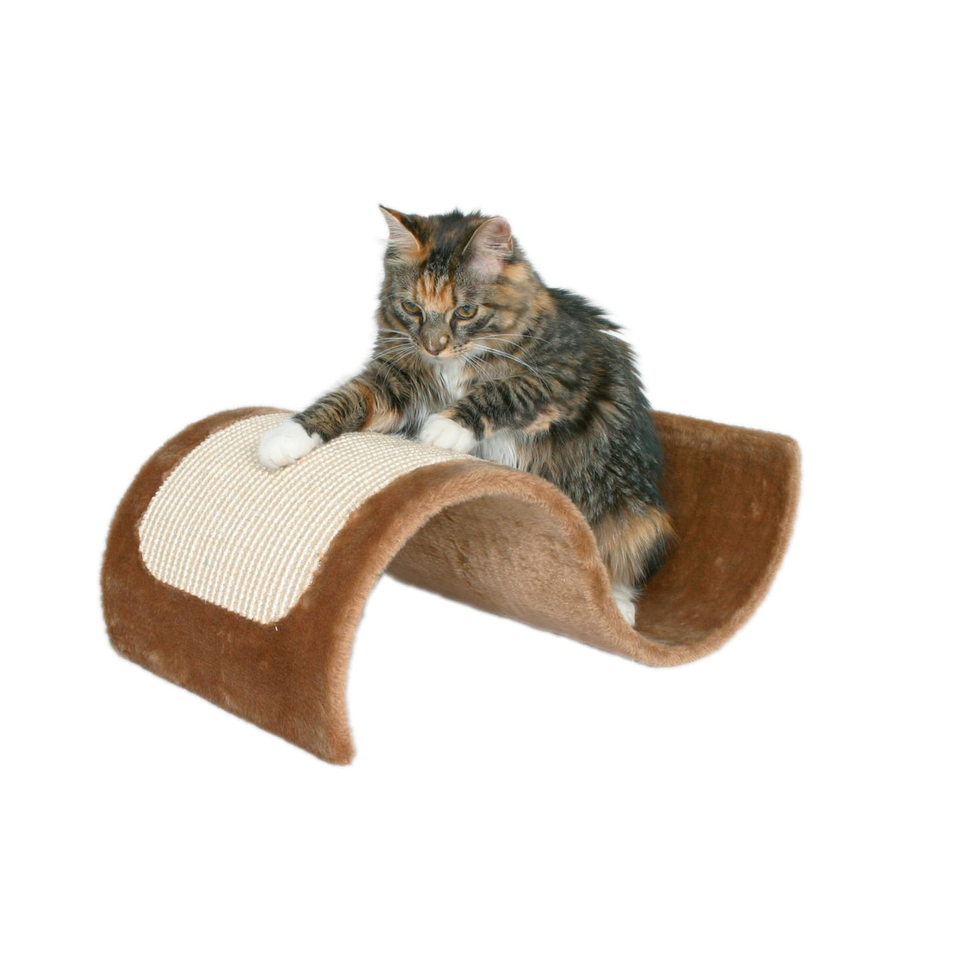 The Scratching Wave will provide endless opportunities for cats to play, scratch, or just relax. Felines can sharpen their claws on the large, durable sisal wrapped scratching surface instead of on your furniture or carpet. If a nap or a place to hide is in order, the cat can curl up in either the waves arm or under the archway, both create the perfect cozy retreat. Spunky cats can perch atop the wave and lie in wait for unsuspecting prey. The sleek design and neutral fabric make an attractive addition to any home. Suitable for cats of all ages and activity levels. Color: brown. Dimensions: 11 x 20 x 7 inches. Weight: 5 pounds.