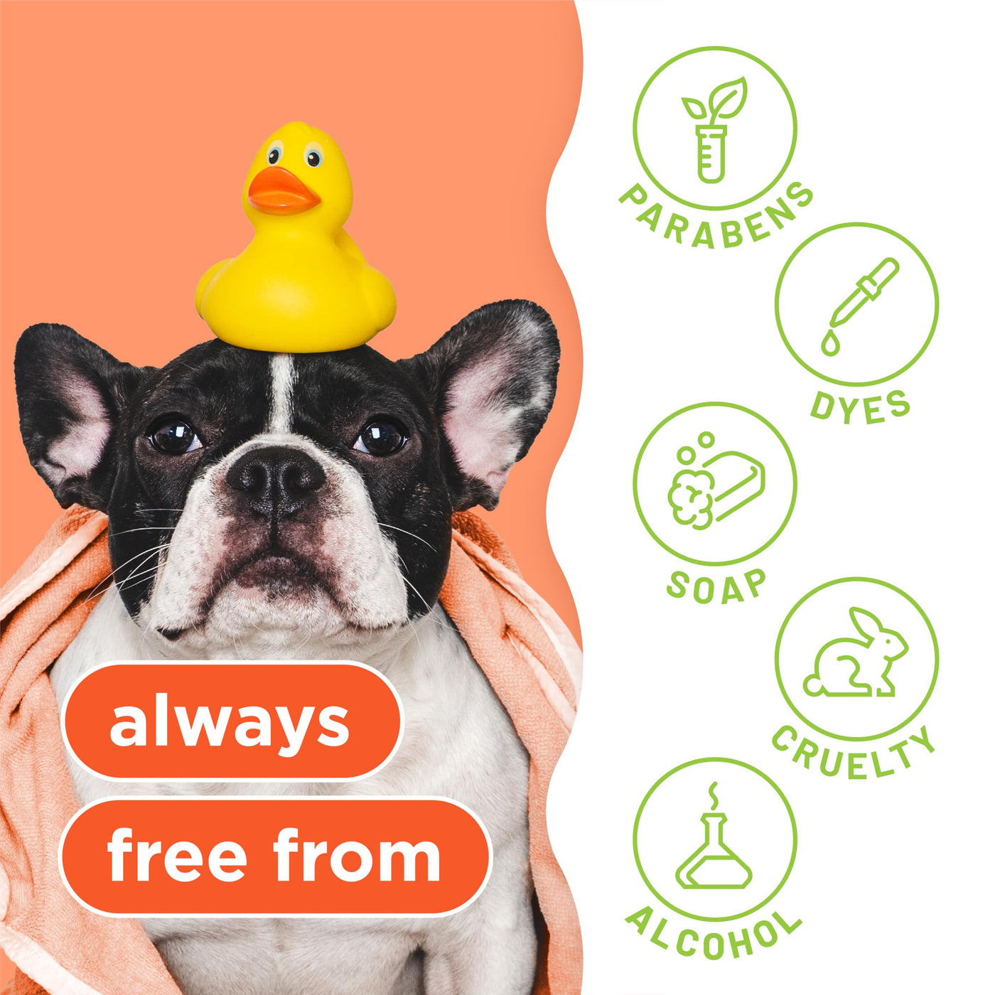 Q: What are the main benefits of using this dog shampoo and conditioner?A: This product cleans and conditions your dog's coat, making it easier to brush while controlling odor and moisturizing the skin. The natural ingredients, like coconut and vitamin E, promote a silky soft coat.