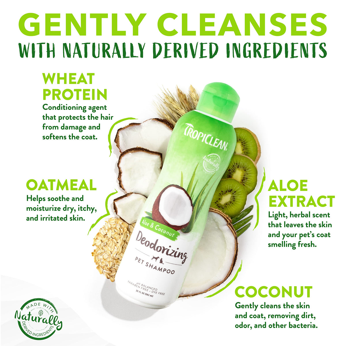 TropiClean Aloe & Coconut Deodorizing Dog & Cat Shampoo effectively eliminates pet odors at their source while replenishing the moisture balance of your pets skin and coat. The tropical scent of aloe and coconut leaves them smelling fresh and ready for cuddles! TropiClean Pet Products are cruelty free.