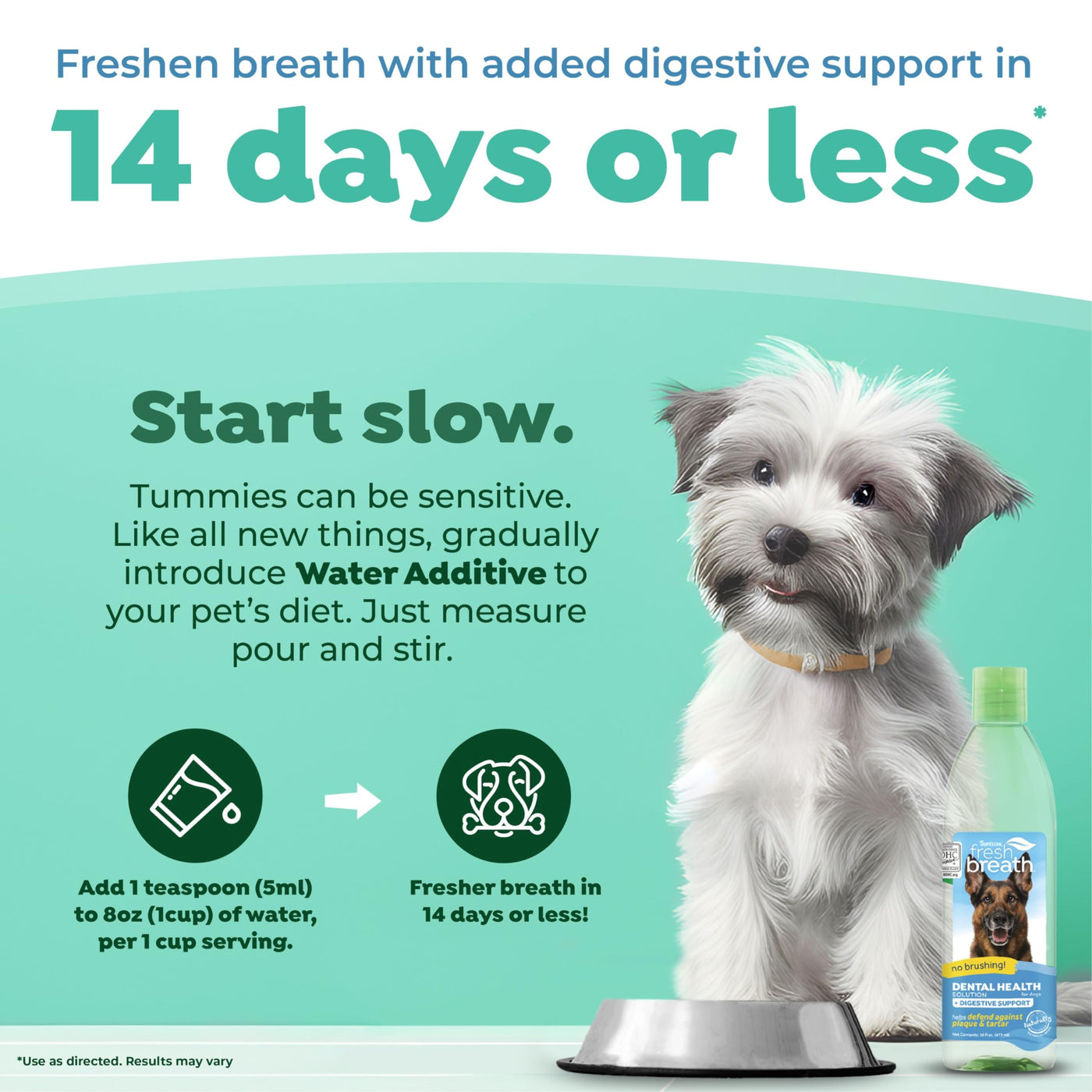 Balanced-Belly: Formulated with prebiotics for a healthy gut and digestion. | Freshens Breath: Combat bad dog breath with tasteless dog mouthwash that lasts up to 12 hours. | Cleans Beyond Teeth: Actively contributes to a clean mouth by reducing plaque and tartar build-up in 14 days or less. | Happy & Healthy: Dogs with sensitive stomachs or new to Fresh Breath for Dogs should start with 1/2 the recommended dose. | VOHC Accepted: This product is VOHC (Veterinary Oral Health Council) recognized.