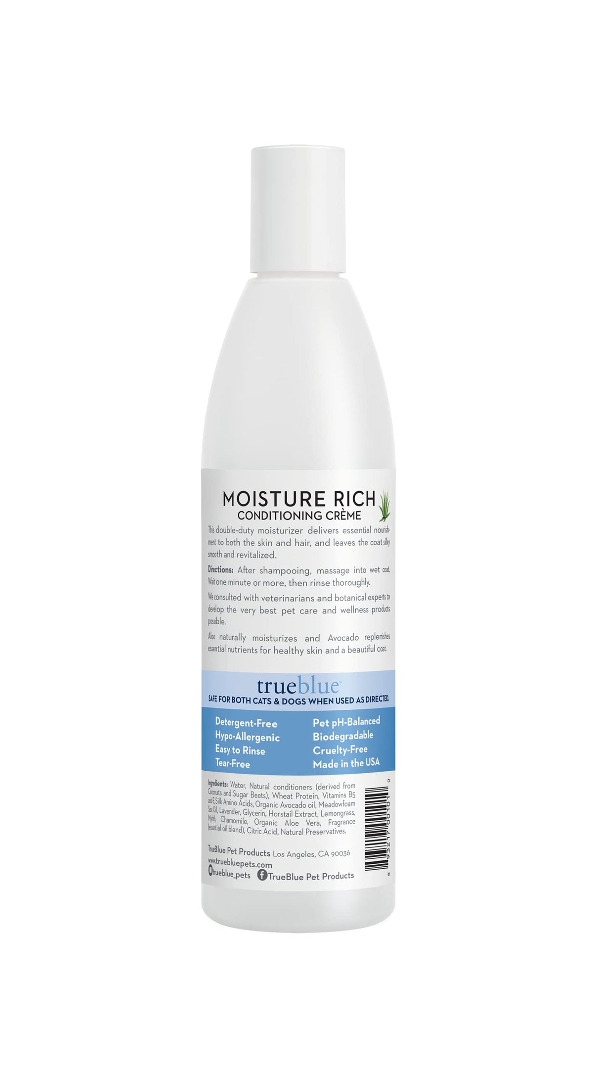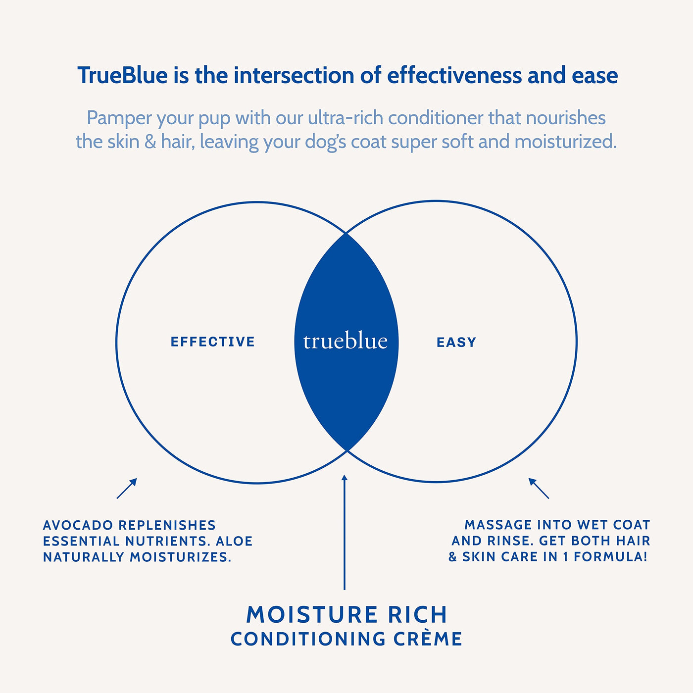 TEARLESS, CONDITIONING FORMULA: Pamper your pup or canine companion with this aromatic conditioning dog cream rinse that moisturizes and nourishes your pet’s coat and skin with a tearless formula. This will leave your dog’s coat beautifully soft and smelling delicious. | ALL-NATURAL BOTANICAL INGREDIENTS: We use Avocado to replenish essential nutrients in the skin and coat and aloe to naturally moisturize. The product is free from detergents, alcohol, parabens and phosphates. | PREMIUM GROOMING SOLUTION: Whether you groom puppies and dogs professionally or in your own home, you’ll want to pamper each poop with this TrueBlue Aloe & Avocado Moisture-Rich Conditioning Dog Crème developed by veterinarians and expert botanists. | THE BEST PET HEALTH AND BEAUTY PRODUCTS: All products from TrueBlue combine the best of Nature & Science. We worked with University Vet Experts to pick the safest and most effective botanical ingredients and to create formulas that really work. | CRUELTY-FREE AND MADE IN THE USA