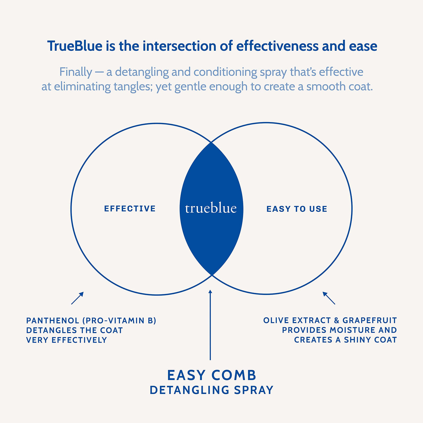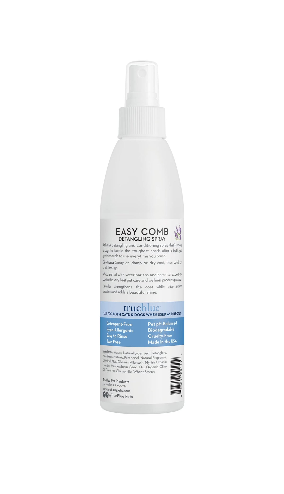 TEARLESS FORMULA: Free your puppy, dog, or cat from tangles with this Lavender & Olive Extract Easy Comb Dog Detangling Spray made with all-natural ingredients and free from detergents, alcohol, parabens and phosphates. Use after the bath and every time you brush, with no sticky build-up. | ALL-NATURAL BOTANICAL INGREDIENTS: We use Organic Olive Extract to smooth the coat and add shine and Organic Lavender to benefit the skin and leave a great smell. | PREMIUM GROOMING SOLUTION: Whether you groom puppies and dogs professionally or in your own home, you’ll want to pamper each poop with this TrueBlue Lavender & Olive Extract Easy Comb Dog Hair Detangling Spray developed by veterinarians and expert botanists. | THE BEST PET HEALTH AND BEAUTY PRODUCTS: All our TrueBlue products combine the best of Nature & Science. We worked with University Veterinarian Experts to pick the safest and most effective botanical ingredients and to create formulas that really work. | CRUELTY-FREE AND MADE IN THE USA
