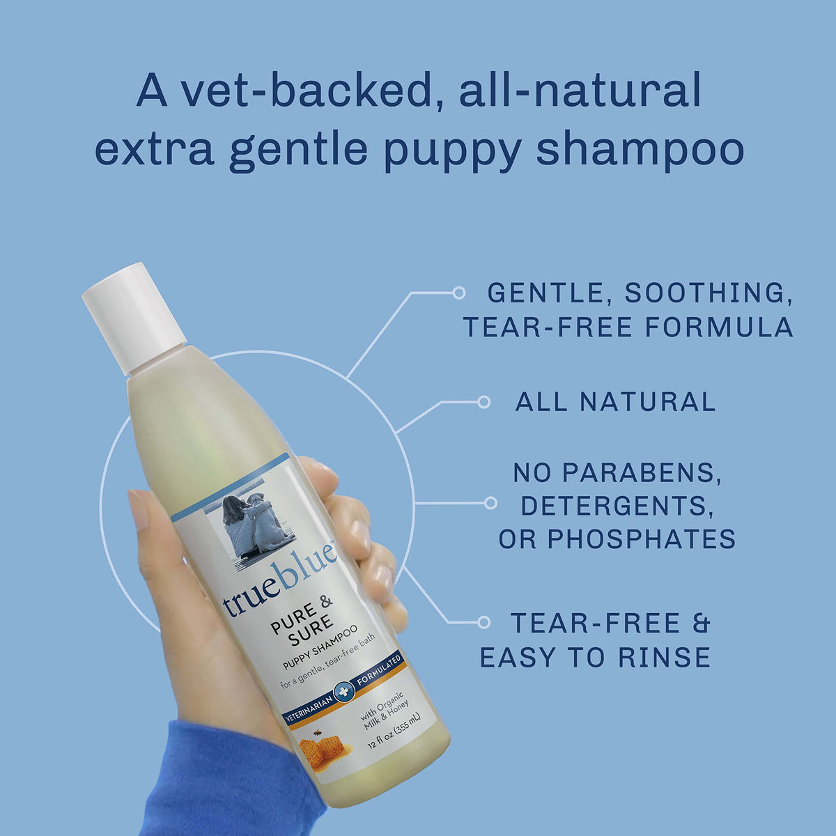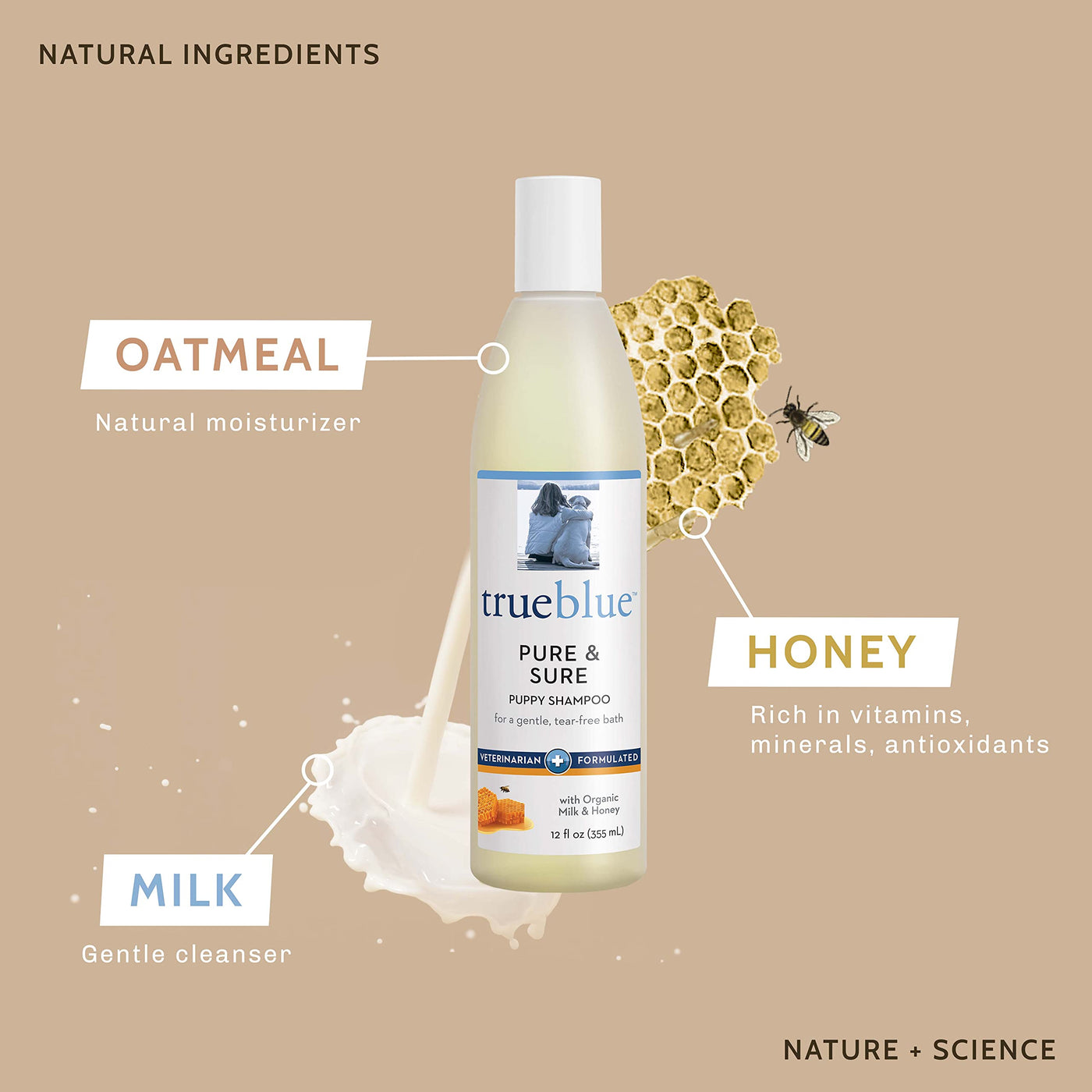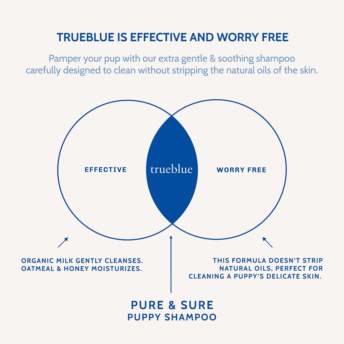 TEARLESS, EXTRA GENTLE FORMULA: Pamper your puppy with this extra-gentle, soothing, tear-free shampoo that is easy to rinse, won’t dry out the skin, and smells lovely. | ORGANIC AND NATURAL INGREDIENTS: We use Organic Milk to gently cleanse a puppy’s delicate skin and Organic Oatmeal because it’s nature’s perfect moisturizer. Our shampoos are free from detergents, alcohol, parabens and phosphates. | PREMIUM GROOMING SOLUTION: Whether you groom puppies and dogs professionally or in your own home, you’ll want to pamper each poop with this TrueBlue Pure and Sure puppy shampoo developed by veterinarians and expert botanists. | THE BEST PET WELLNESS PRODUCTS: All our TrueBlue products combine the best of Nature & Science. We worked with University Veterinarian Experts to pick the safest and most effective botanical ingredients and to create formulas that really work while being easy on the environment. | CRUELTY-FREE AND MADE IN THE USA