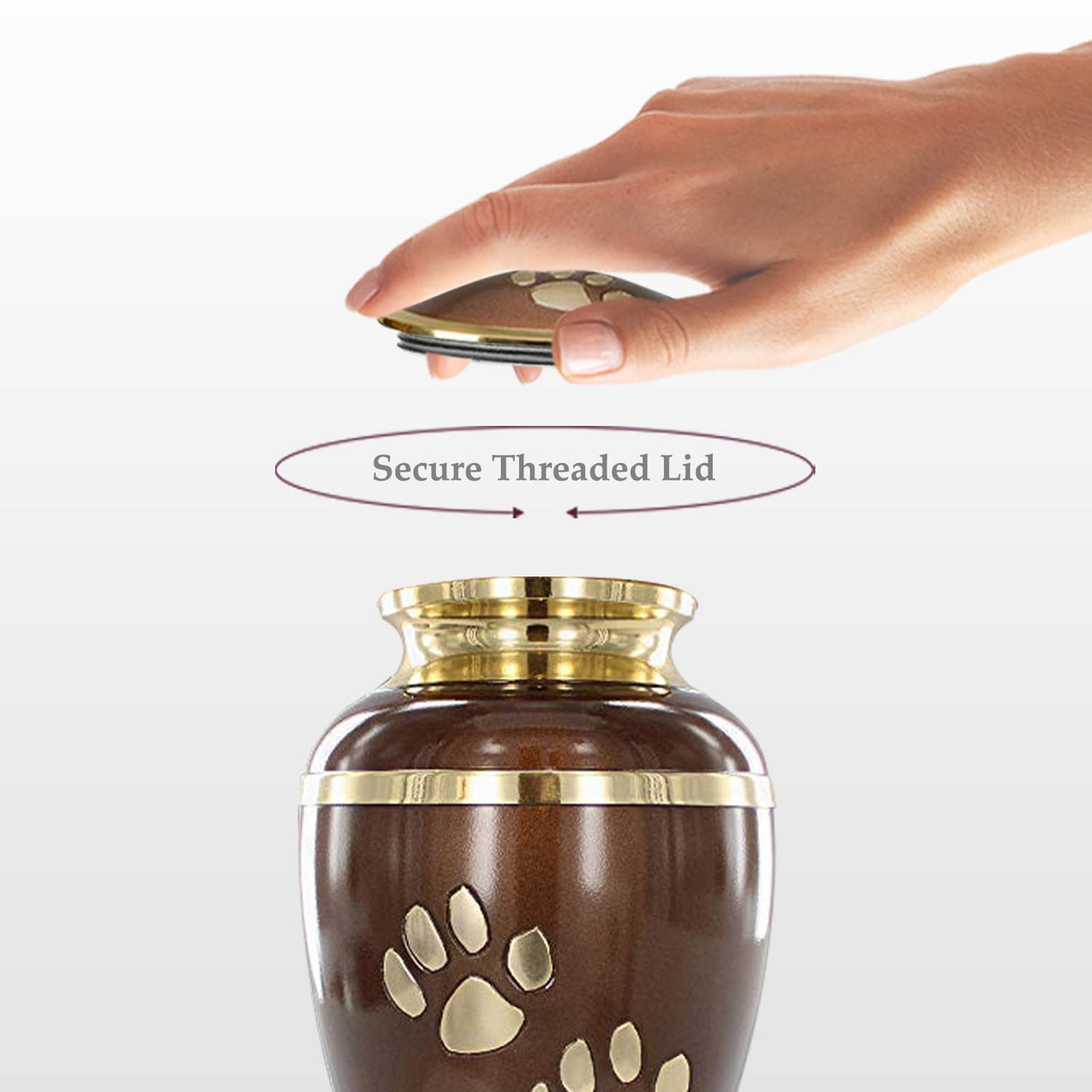 Q: How do I securely close the pet urn?A: The urn features a secure screw-on threaded lid that ensures your pet's ashes are safely stored and protected.