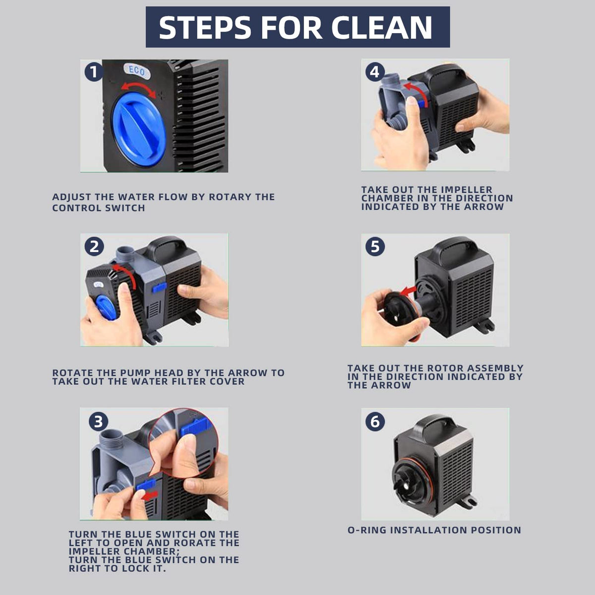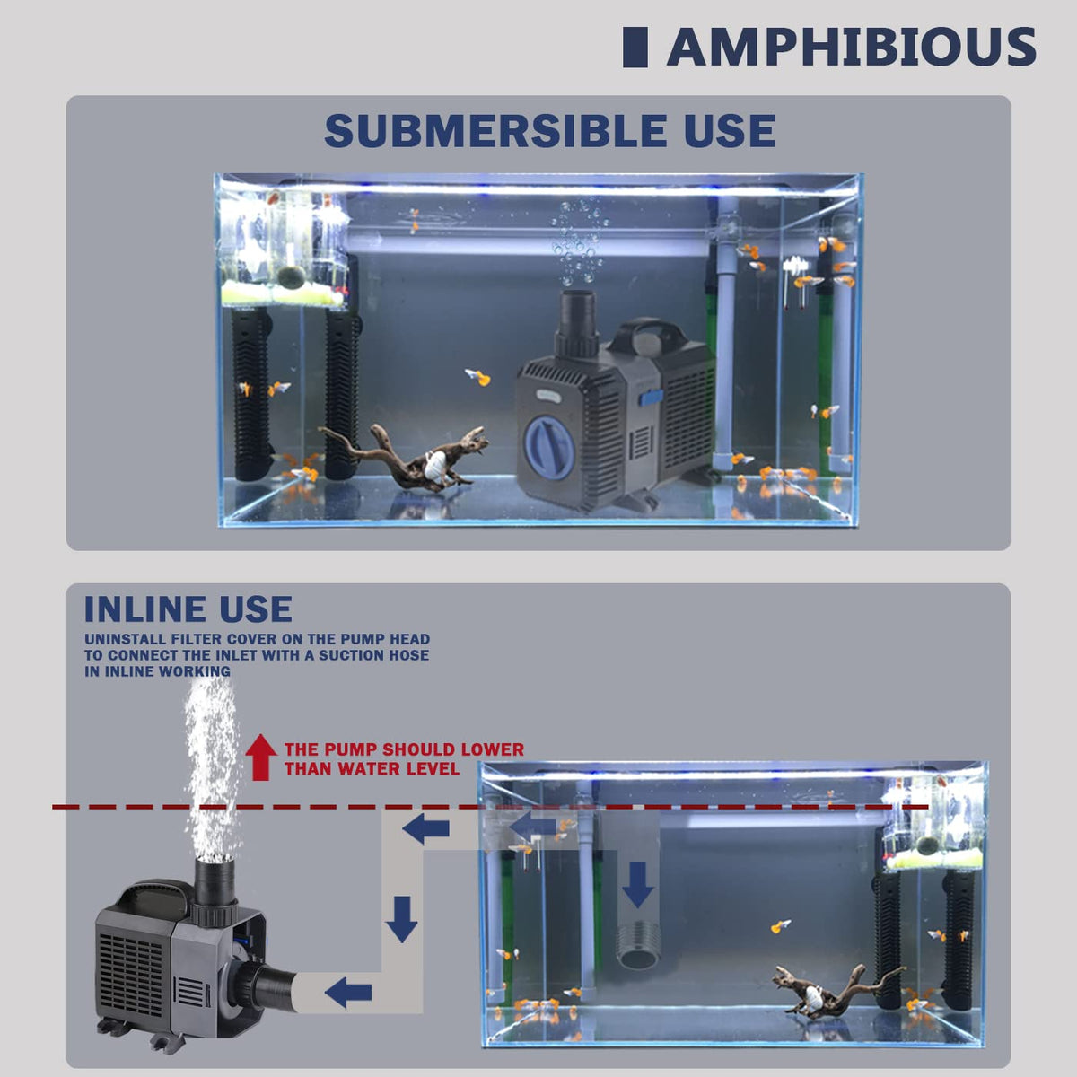40W power with max output 1375GPH.Apply to ponds,rocky,bourn,aquarium tanks with water recycling equipment matching.Novel design and generous,use the variable frequency technology,small power,large flow,high head,super silence and amphibious.Use ceramic shaft,wear resistance,no rust,long service life,Both fresh and seawater,do not contain copper element.This product realize free tool demolition and easy to clean.The outlet realize multistage size,stable for a variety of pipe diameter connection.The locked-rotor protection function,immediately cut off power after impeller jamed.Adjustable flow rate. Energy saving up to 60% with variable frequency technology