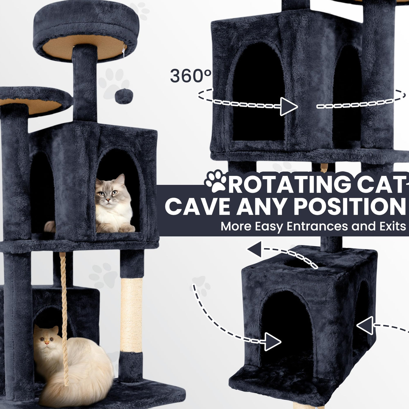 Tscomon 58.5Inch Large Cat Tree Tower Condo For Indoor Cats, Soft Plush Multi-Level Climbing Tree Cat House With 1 360 Rotating Cat Cave, Scratching Post, More Entrance/Exit, Sisal Rope, Smoke Gray