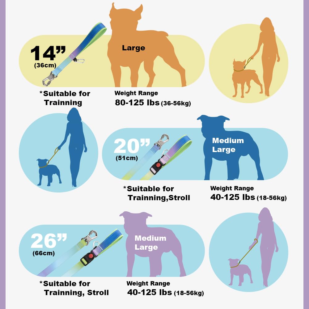 - Tspro Short Leash Is Made Of Polyester, Breathable, Soft To The Touch And Comfortable Without Constricting, Made From Strong And Durable Polyester, Providing A Relaxed And Cozy Fit. Perfect For Large Dog - The Heavy Duty Safety Locking Metal Buckle Selected High-Quality Metal Buckle With High Hardness, Featuring 360 Rotation To Prevent Tangling. Easy And Convenient Operation, You Can Also Be Operated With One Hand, Simply Rotate The Screw Lock To The Left To Open, And Gently Press To Secure, Rotate The Screw Lock To The Right To Tighten, Safe And Sturdy - Comfortable Padded Handdle Dog Leash For Walking Features A Soft Padded Handle For Amazing Comfort. The Short Handles Leash Helps Put Less Strain On Your Hand When Your Dog Pull, Wrist Comfortable Even With The Most Playful Dogs - Great Control Short Leash For Higher Traffic Areas Or Crowded Areas, Busy Street, Keeps The Dog Right By Your Side, Good Grip On Your Dog To Keep Him/Her Close When Necessary, Perfect Length For Service Dog Handlers, Dog Trainers, Or Dog Walkers Product Details: Available In 4 Colors To Choose: Gradient Orange Red Cute Dog Leash | Multi Colored Dog Leash | Blue Pink Gradient Leash | Rainbow Gradient Dog Training Lead 3 Sizes Of Pet Leash: Size S: 14 Inches(36 Cm) X 1 Inches(2.5 Cm) Size M: Adjustable 17 Inches(43 Cm) - 20 Inches(51Cm) X 1 Inches(2.5 Cm) Size L: Adjustable 19 Inches(48 Cm) - 26 Inches(66 Cm) X 1 Inches(2.5 Cm) Product Inculded: 1X Tspro Dog Walking Leash