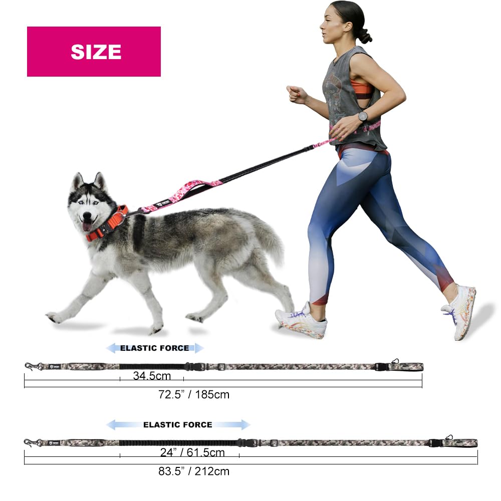 Q: How do I adjust the length of the bungee leash?A: The leash can be adjusted from 56.5 to 72.5 inches (144-185 cm) without extension and from 67.5 to 83.5 inches (170-212 cm) with extension, allowing for customizable length based on your needs.