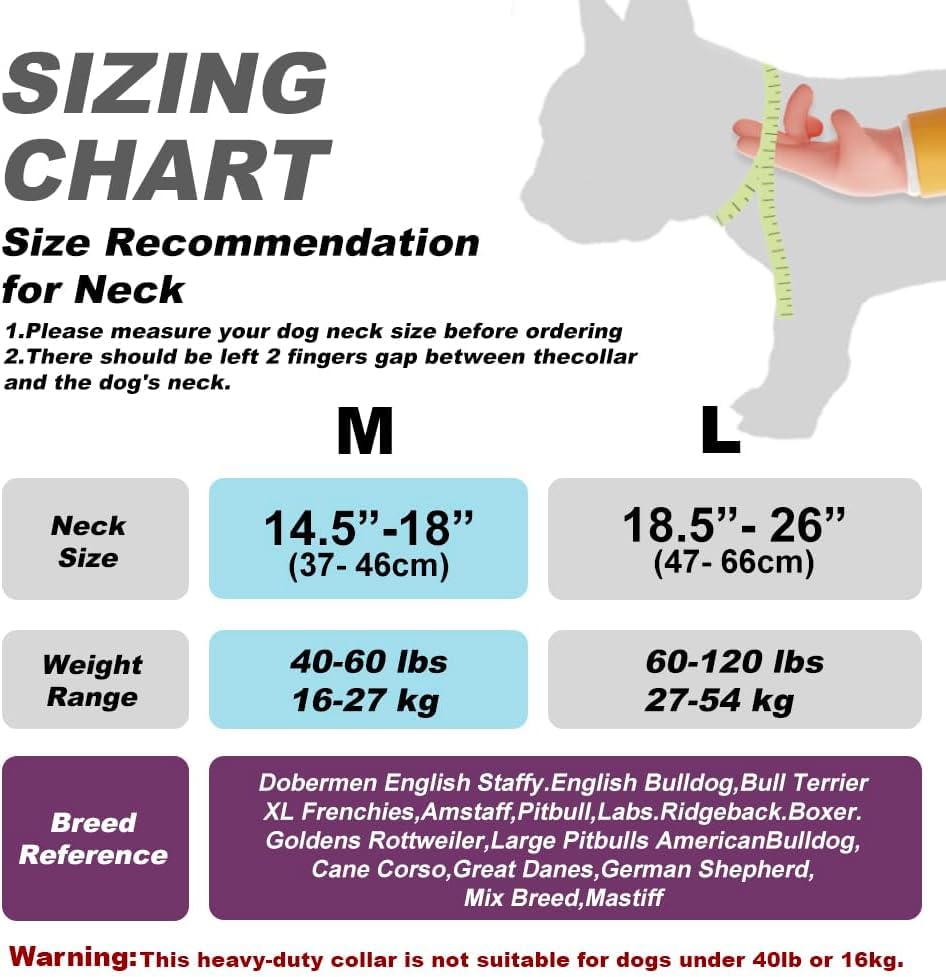 Q: What sizes are available for the TSPRO Premium Dog Collar?A: The TSPRO Premium Dog Collar is available in Size M, which adjusts from 14.5" to 18", and Size L, which adjusts from 18.5" to 25.5". Ensure you measure your dog's neck and maintain a 2-finger gap for optimal comfort.