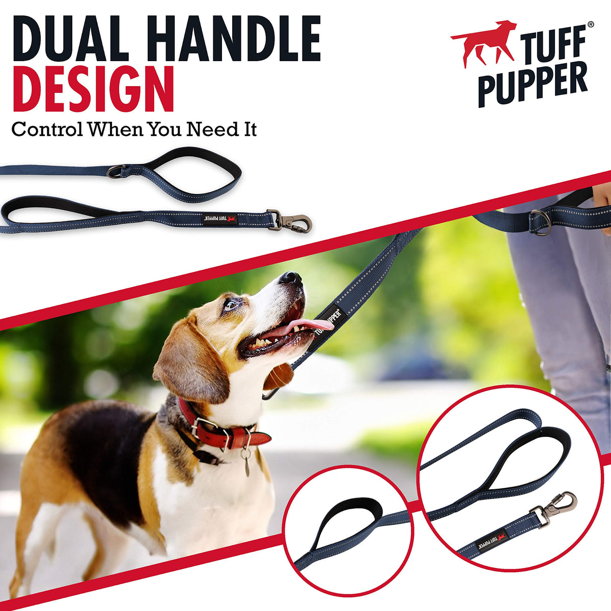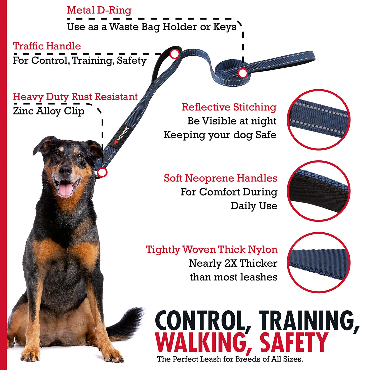 Q: How does the dual handle feature enhance control during walks?A: The Tuff Pupper leash features dual neoprene padded handles, providing enhanced control and comfort. The secondary handle near the clip allows for tighter control when navigating crowded spaces or managing your dog in high-stress situations, ensuring you can maintain better command.