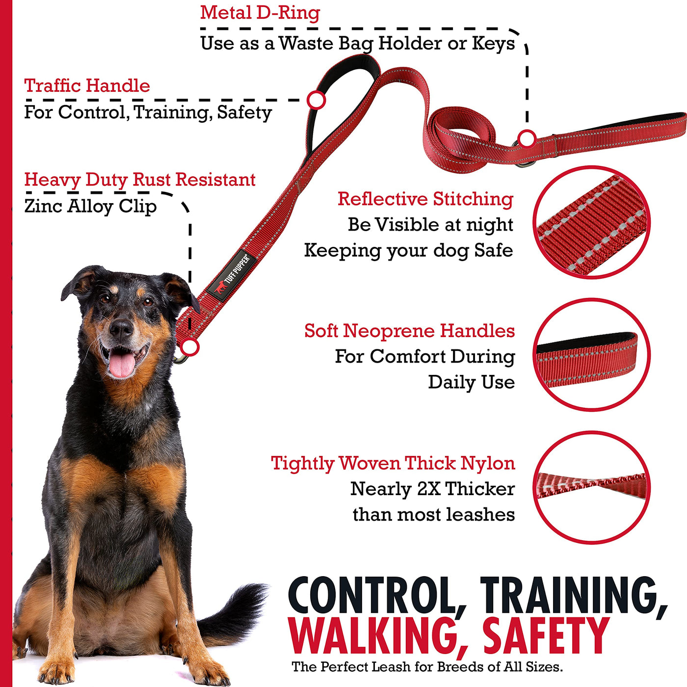 Tuff Pupper Heavy Duty Double Handle Leash - Twist Lock Carabiner Clip For Strong Medium & Large Dogs - Reflective, 6Ft