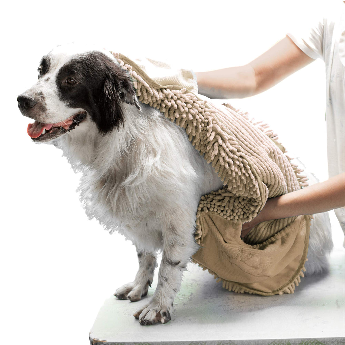 Q: How absorbent is the microfiber towel compared to regular towels?A: This ultra-absorbent microfiber shammy towel can hold up to 7 times its weight in water, which allows you to dry your pet quickly and efficiently, far outperforming standard cotton towels.