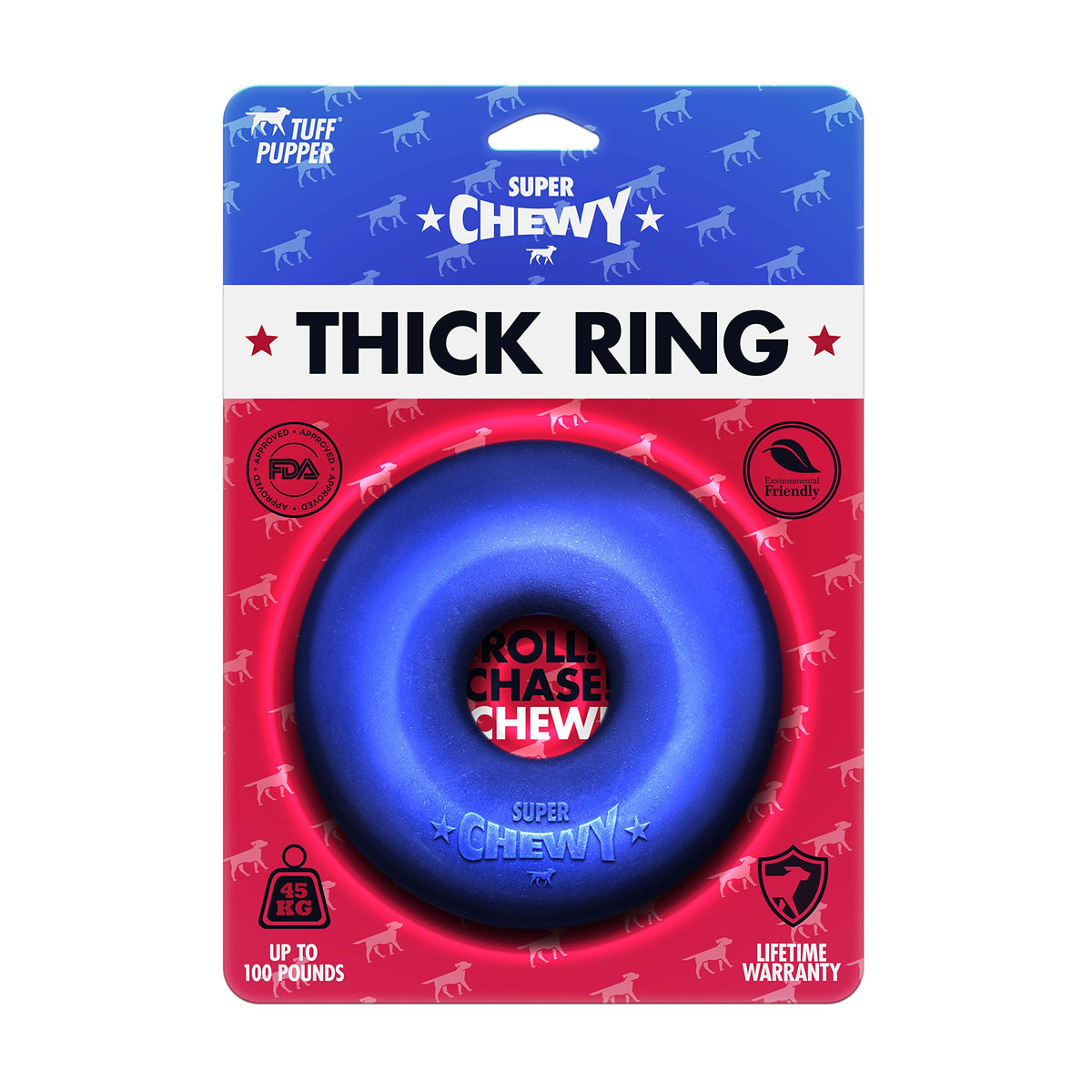 Q: What are the dimensions of the Tuff Pupper SuperChewy Tough Dog Ring Toy?A: The Tuff Pupper dog ring toy measures 6.5 inches in diameter and weighs 2.2 lbs, making it a perfect size for large breed dogs.