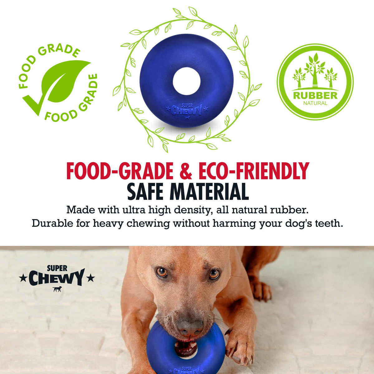 Q: What is the Tuff Pupper SuperChewy Tough Dog Ring Toy made of?A: The Tuff Pupper SuperChewy Tough Dog Ring Toy is constructed from 100% safe and non-toxic, high-density, all-natural solid rubber, ensuring durability and safety for your pet.