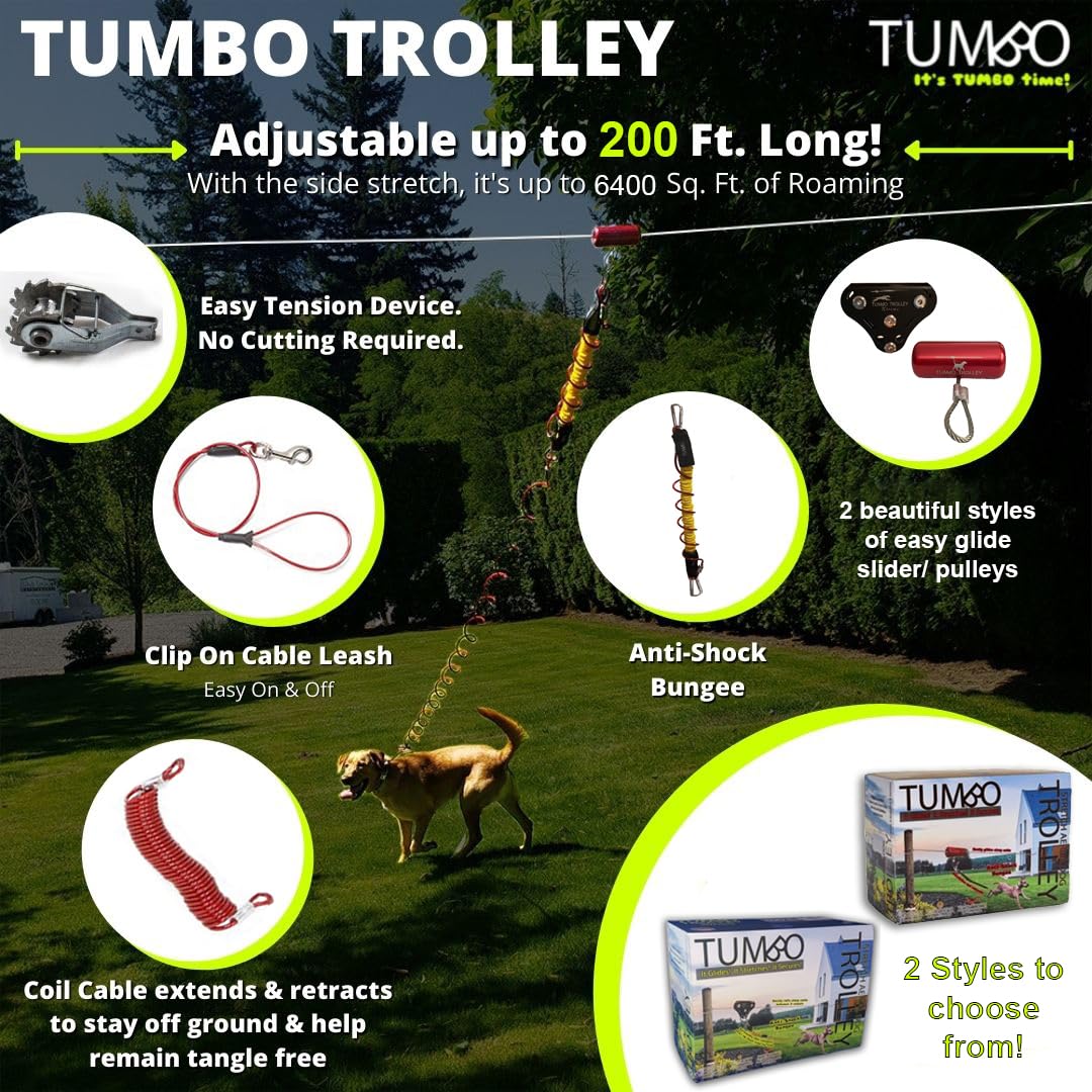The Tumbo Trolley Is Like No Other Dog Runner On The Market. When Installing A Fence Around Your Back Yard Is Not In The Budget, Our Dog Run Cable Can Come To The Rescue. It Allows Roaming In 3 Different Lengths In 100Ft,150Ft, And 200Ft Long Overhead Steel Cable Versions. It Has Several Unique Features Which Allows It To Stand Out From Other Basic 100 Ft Dog Leashes On The Market. First, Set Up Is Simple Using Our Pre-Looped Durable Cable To Wrap Around A Tree/Connection Point. Then Tighten The System Up Easily To The Second Tree/Connection Point With Our Ratchet Style Tensioner With The Included Wrench. No Need To Cut Any Cables Or Try To Fumble With Any U Bolts To Set The System Up And Get The Main Line Tight. In Most Cases,A Single Person Can Easily Set The System Up. We Use Durable Materials That Will Hold Up In All Weather Conditions. Our Aluminum Slider Glides Effortlessly Along The Galvanized Heavy Duty Cable And Has A Stainless Steel Insert For Extra Wear Protection. Our One Piece Slider Will Never Rust Or Bind Up And Looks Beautiful In The Bright Red Finish. Our Coiled Cable Lead Line Expands And Retracts As Your Dog Moves Helping To Remain As Tangle Free As Possible. Our Bungee Power Coil Provides Anti-Shock When Your Dog Reaches The End Of The Roaming Area. Matched With The Tumbo Harness To Keep Your Dog Safe At All Times With No Shock Loading. Also Included Is A 3 Ft Detachable Cable Leash Which Allows Detaching From The System While Keeping Your Dog Secure At All Times. With Our Coiled Long Lead For Dogs And Leash It Allows Over 15 Feet Of Side To Side Travel From The Overhead Dog Run Giving Your Puppy A Lot Of Roaming Area. We Also Include Two Stoppers In Our System As Well If You Need To Limit The Travel For Your Doggie. We Also Have A Travel Trolley Which Is Great For Parks And Camping That Require Dog Leashes. Make Sure To Combine This With Our Camping Dog Harness, And Add This System To Your Dog Backpack And Dog Hiking Accessories.