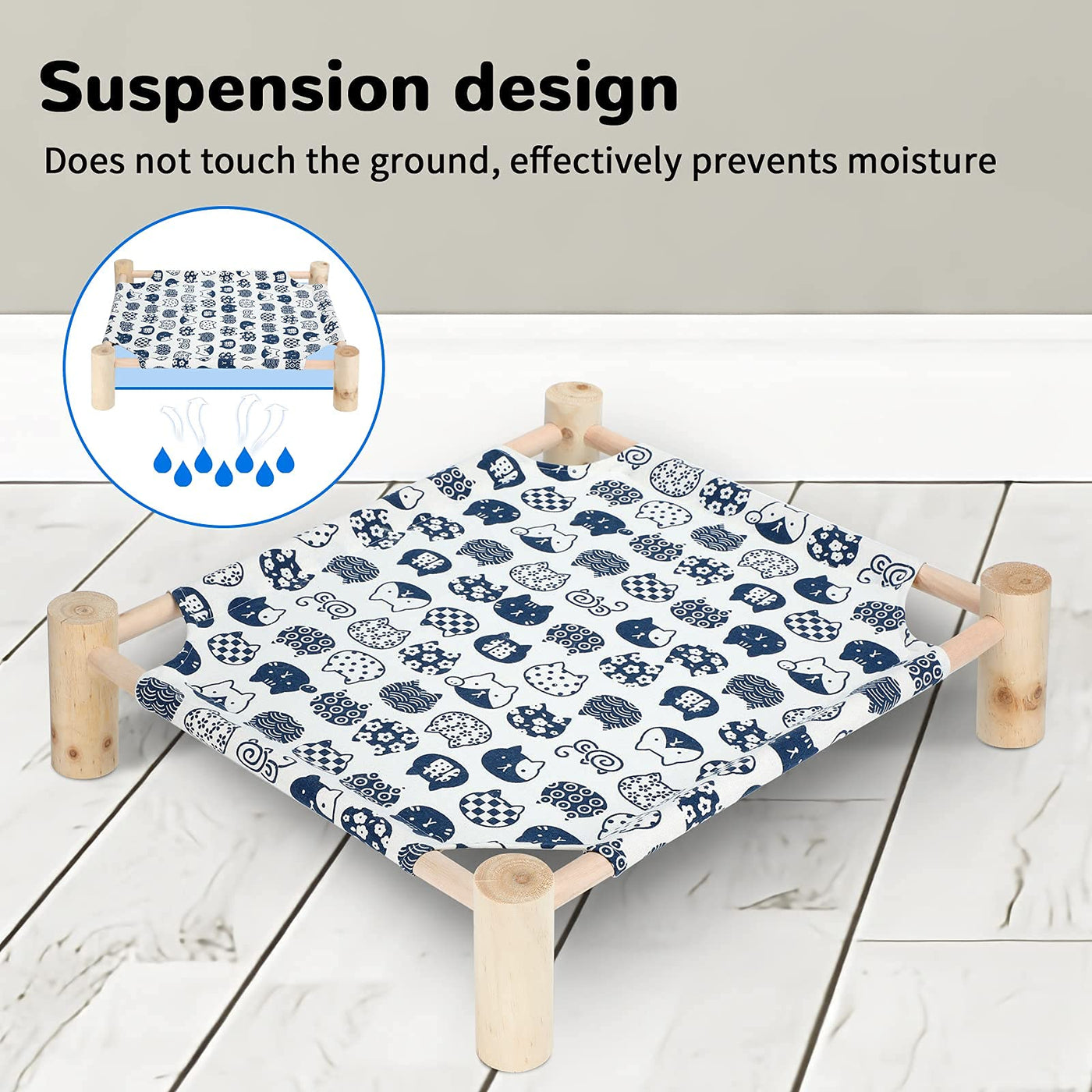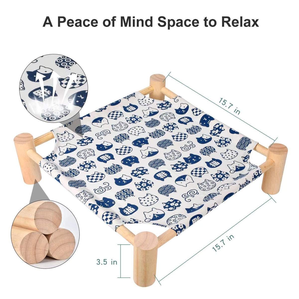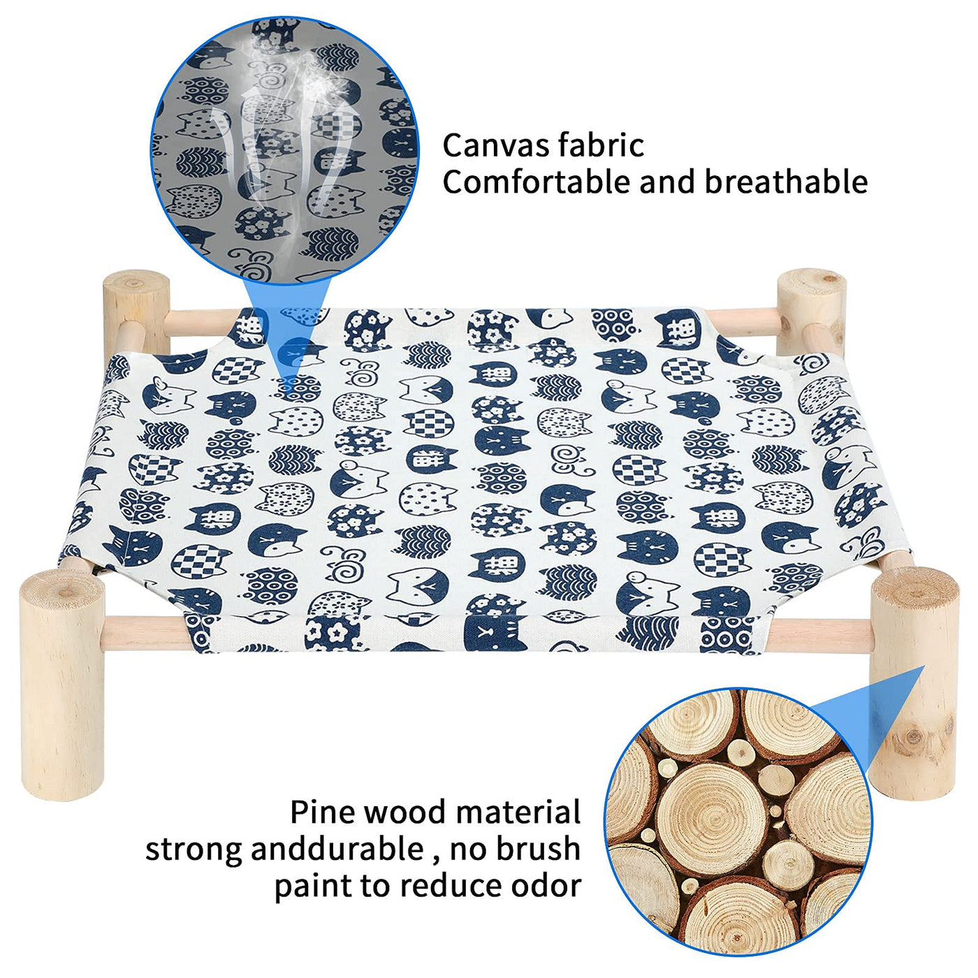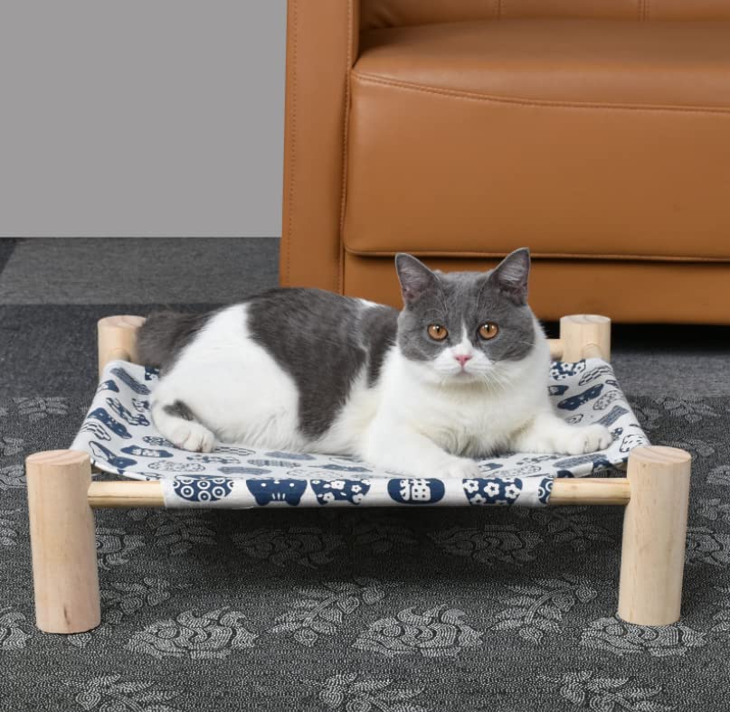BREATHABLE & cOMFORTABLE MATERIAL] ---The cat Hammock Bed is used of breathable and soft canvas fabric breathable strong and durable and will not irritate pet skin so your cat has peace of mind when they are on the bed EASY TO REMOVABLE & WASHABLE] ---The wood cat bed can easily remove and assembly from the stand easy to washing and drying wooden pet bed can be used indoors and outdoors STABLE SUPPORT]---natural pine wood frame can provide more stable supportOur Elevated cat shelves dont shake and tip over Holds comfortably up to 39 lbs ANTI MOISTURE PROOF ] ---Elevated cat bed is off-ground suspension design no contact with the ground Anti-moisture dirt effectively and keep your cats and puppies away from various skin diseases Suit for all seasons Satisfaction guaranteed with Our Pet Hammock] -We want our customers to be happy with our pet beds We promise to provide free replacement service or refund if you have any issues about our pet bed please feel free to reach out to us