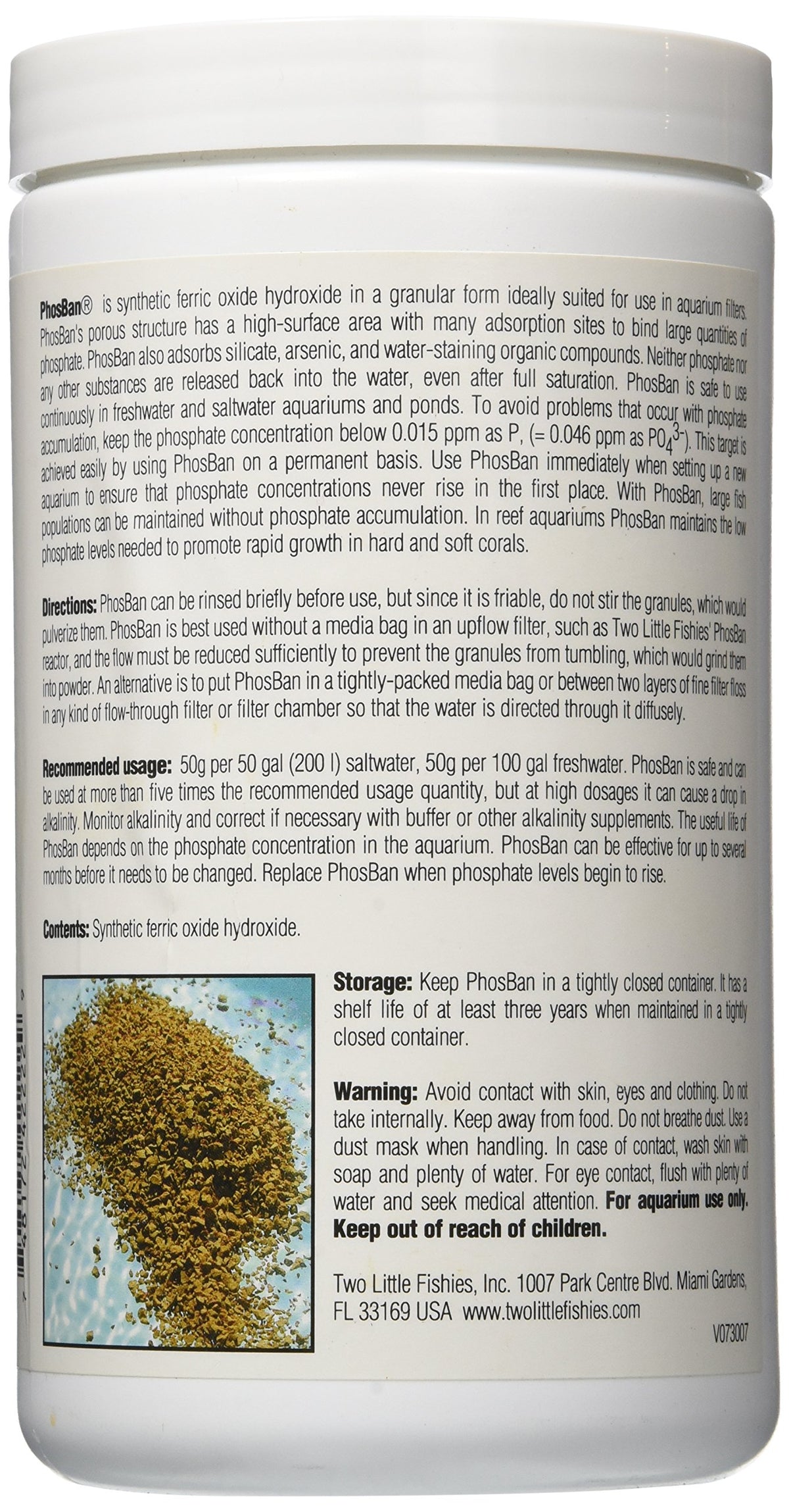 Q: What is the main function of Two Little Fishies ATLPB4 Phosban?A: The Two Little Fishies ATLPB4 Phosban is designed to effectively adsorb phosphate from both saltwater and freshwater environments, helping to maintain low phosphate levels and prevent algae growth.