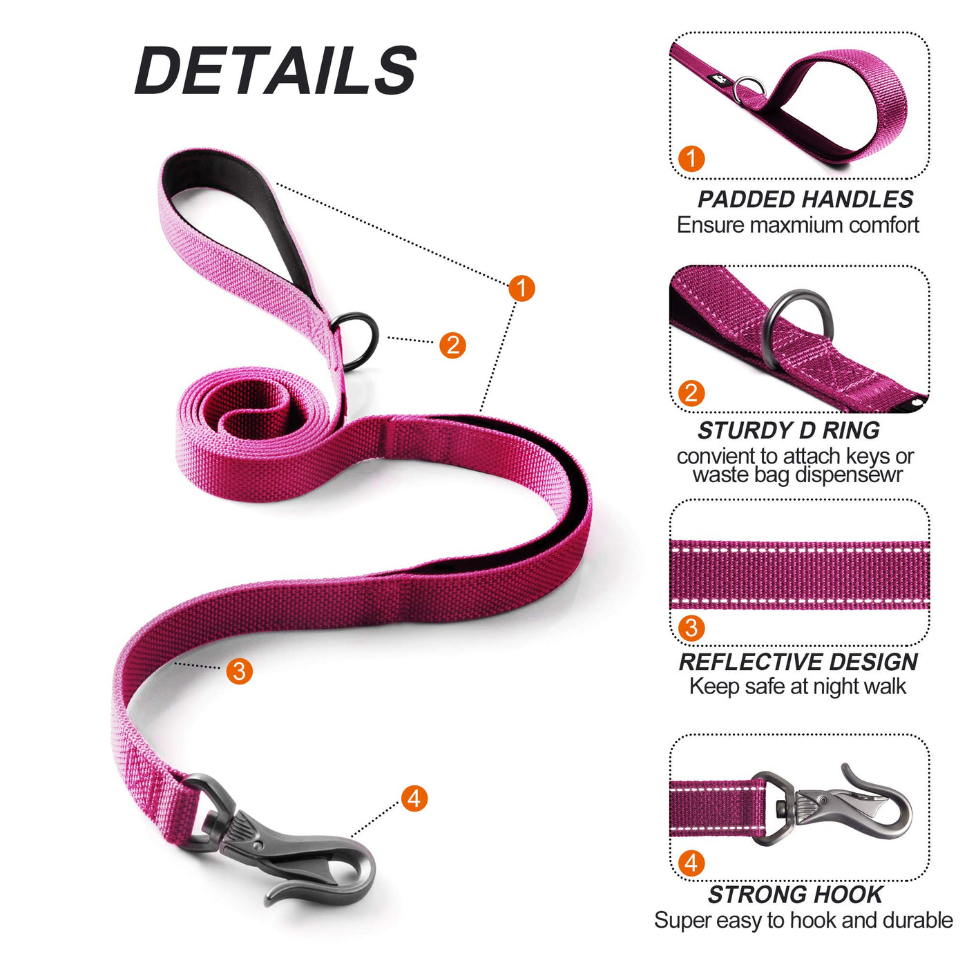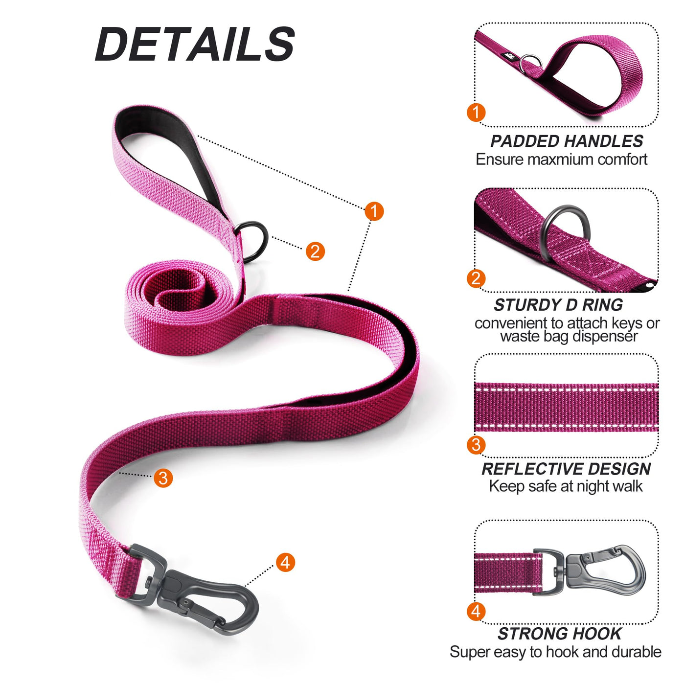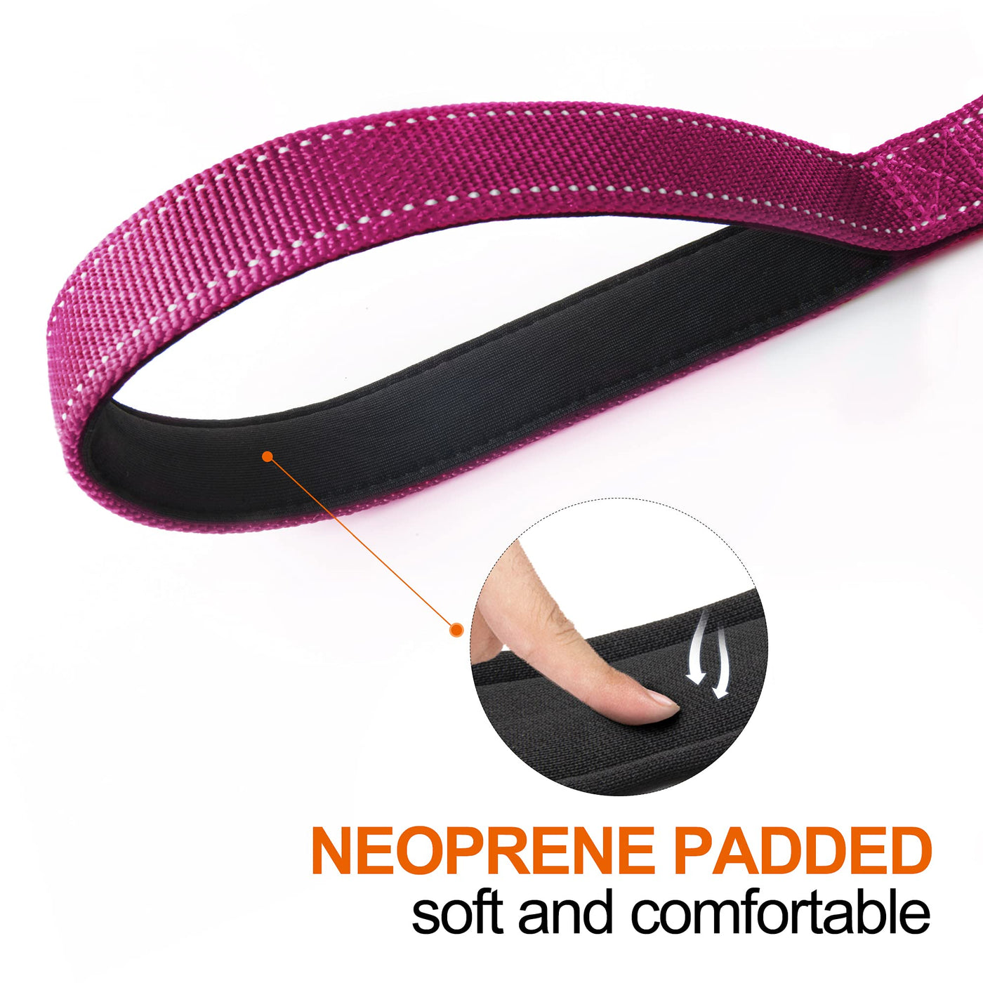 SOFT PADDED DUAL HANDLES: padded handle provide maximum comfort. Extra handle at the end of the leash allows close control of your dog. 360° ROTATING CLASP: Auto lock hook, super easy to use, just pull the hook and it works(automatically clip to ring). REFLECTIVE DOG LEASH: Highly reflective in the night, make your dog visible and can be seen in the dark. HIGH DENSITY WEBBING: Extra strong structure make this leash durable and can work for many years. STURDY D RING: Convenient ring to attach waste bag dispenser , key or water bottle.