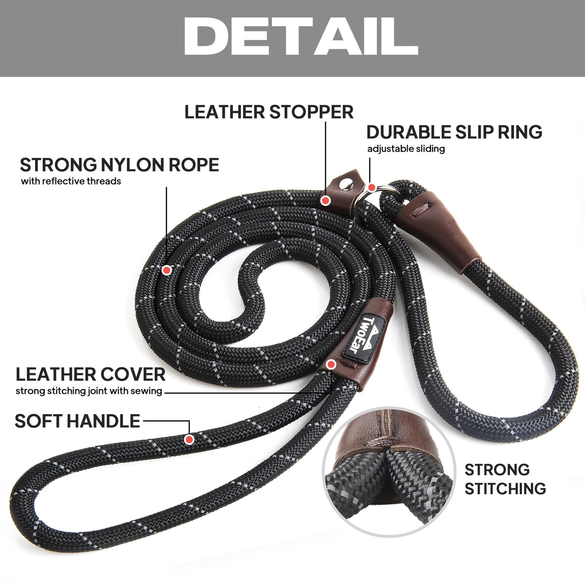 ?Strong And Durable?This Premium slip dog leash evolved from mountain climbing rope it is made of sturdy nylon material. 0.5inch diameter and soft handle give you and your dog Maximum protection.