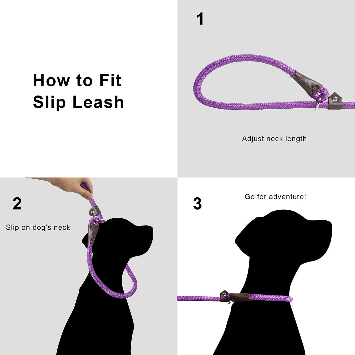 ?Multifunction and Convenient?Premium British-style slip lead.This dog slip lead with the adjustable loop you can adjust slipknot to fit any neck size no collar or harness needed extremely simple and easy to put on or off.