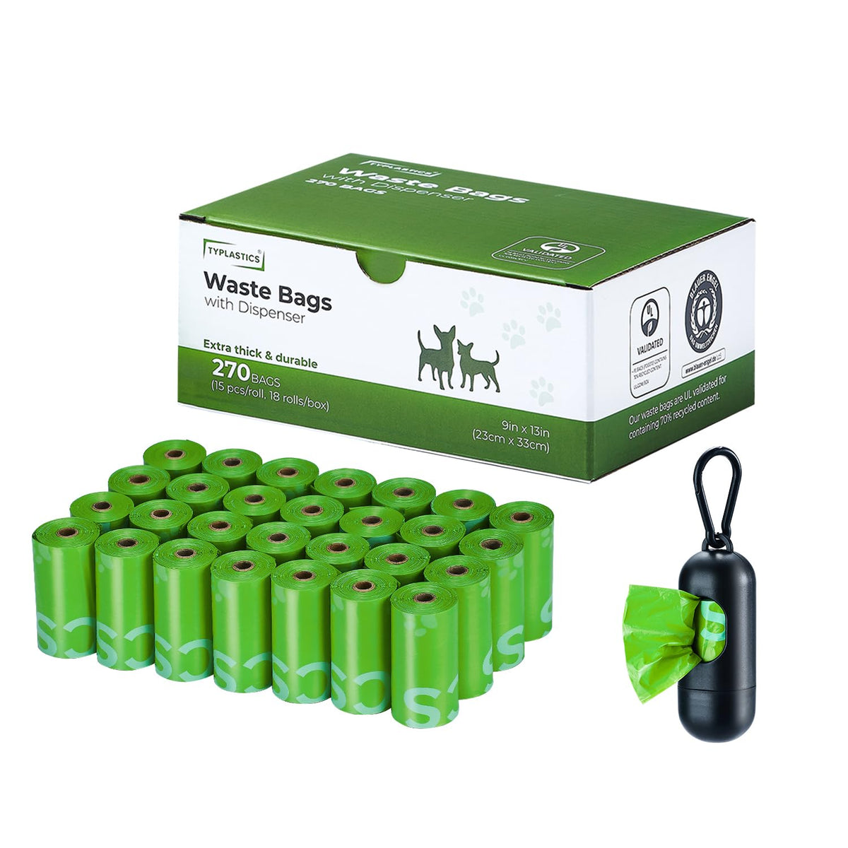 Typlastics Poop Bags For Dog Waste, 270 Count, With Dispenser, Unscented, 18 Pack Of 15, Lime Green, 13 Inch X 9 Inch