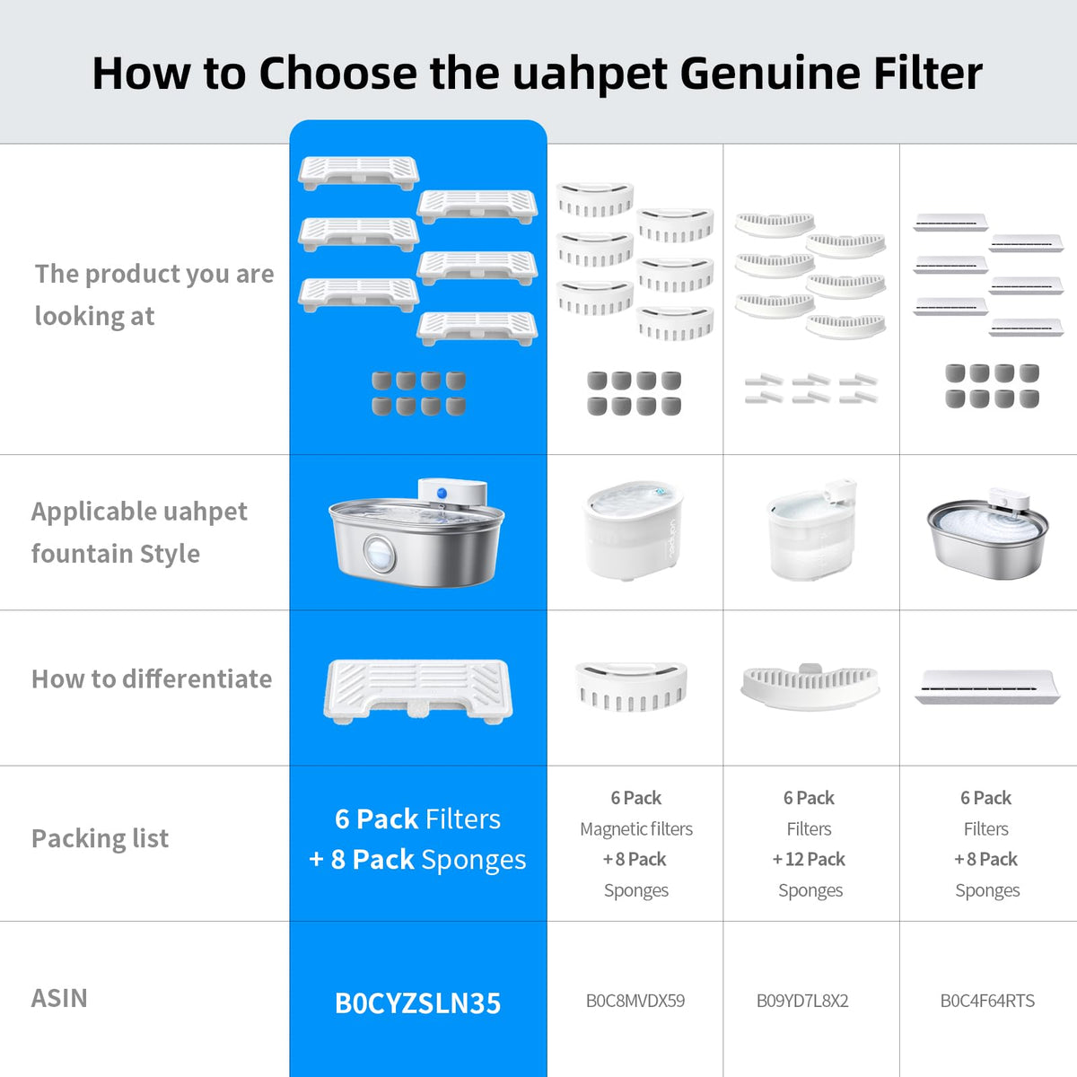 uahpet 6 Pack Replacement Filters & 8 Pack Replacement Filter Sponges for Stainless Steel Pet Fountain Pro (with water level window version), water fountain is not included