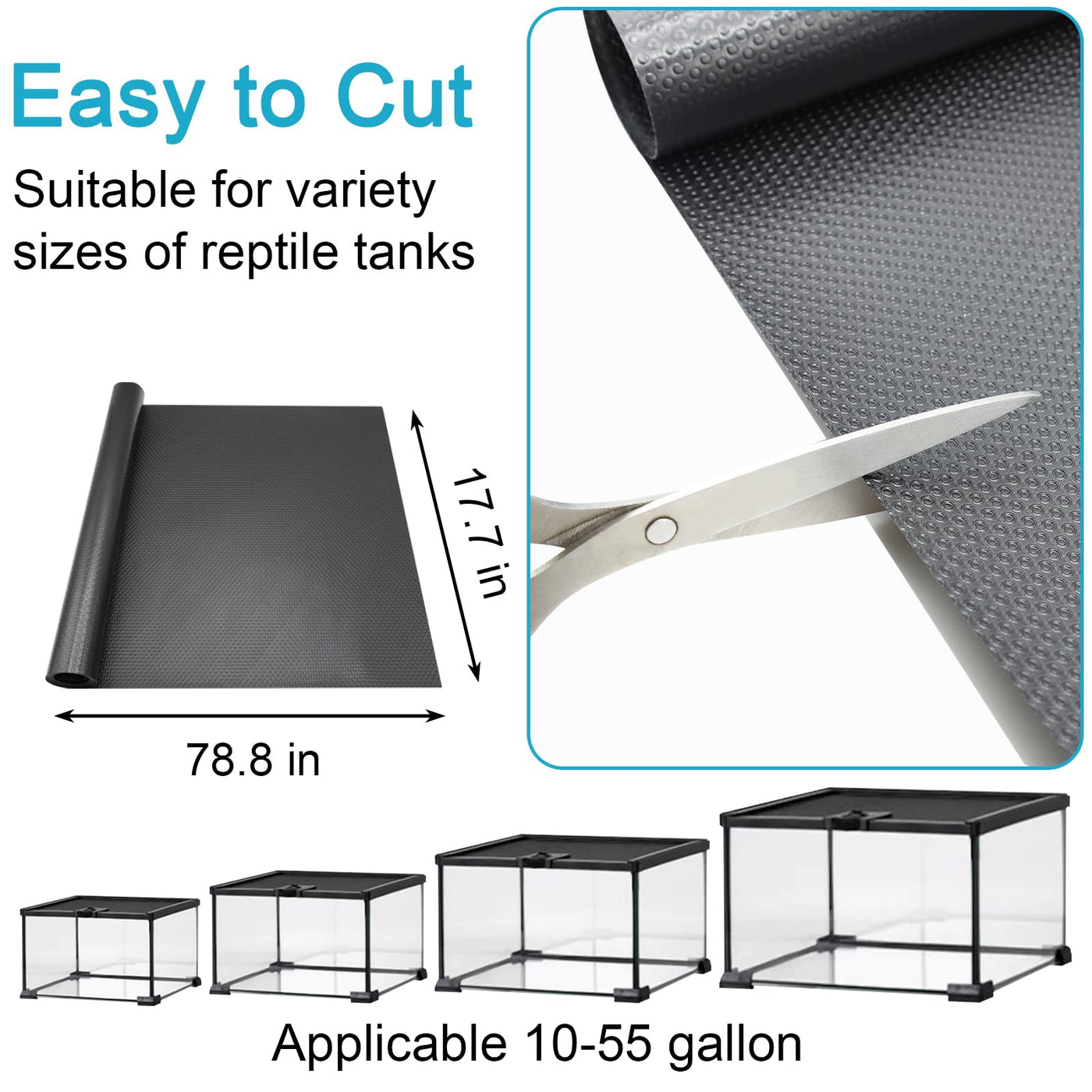 Product Description Uigidori non-slip reptile carpet floor liner provide a more comfortable and safe living environment for your reptile pets. Material: EVA. Size: 17.7 x 78.7 inches Color: Black. Features Waterproof and easy to clean, spot cleaning is faster and more efficient. Washable and reusable, no need to replace frequently. Reptile-friendly material, non-adhesive surface prevents their claws from getting stuck. Non-slip, textured surface helps prevent slipping and joint injury. Easy to cut and install, it can be cut to fit various sized tanks and enclosures. The black material absorbs heat, helping to maintain a comfortable ambient temperature. Application Reptile tank mat is suitable for a variety of reptile species, such as bearded dragons, leopard geckos, lizards, iguanas, hermit crabs, snakes, tortoises, etc. Care instructions Spot cleaning can be done by wiping away waste with a damp cloth or paper towel. For a more thorough cleaning, it is recommended to remove the liner from the tank, wash it with a reptile-safe disinfectant solution and let it dry. Package content 1 pcs reptile terrarium substrate liner (17.7 x 78.7 inches)