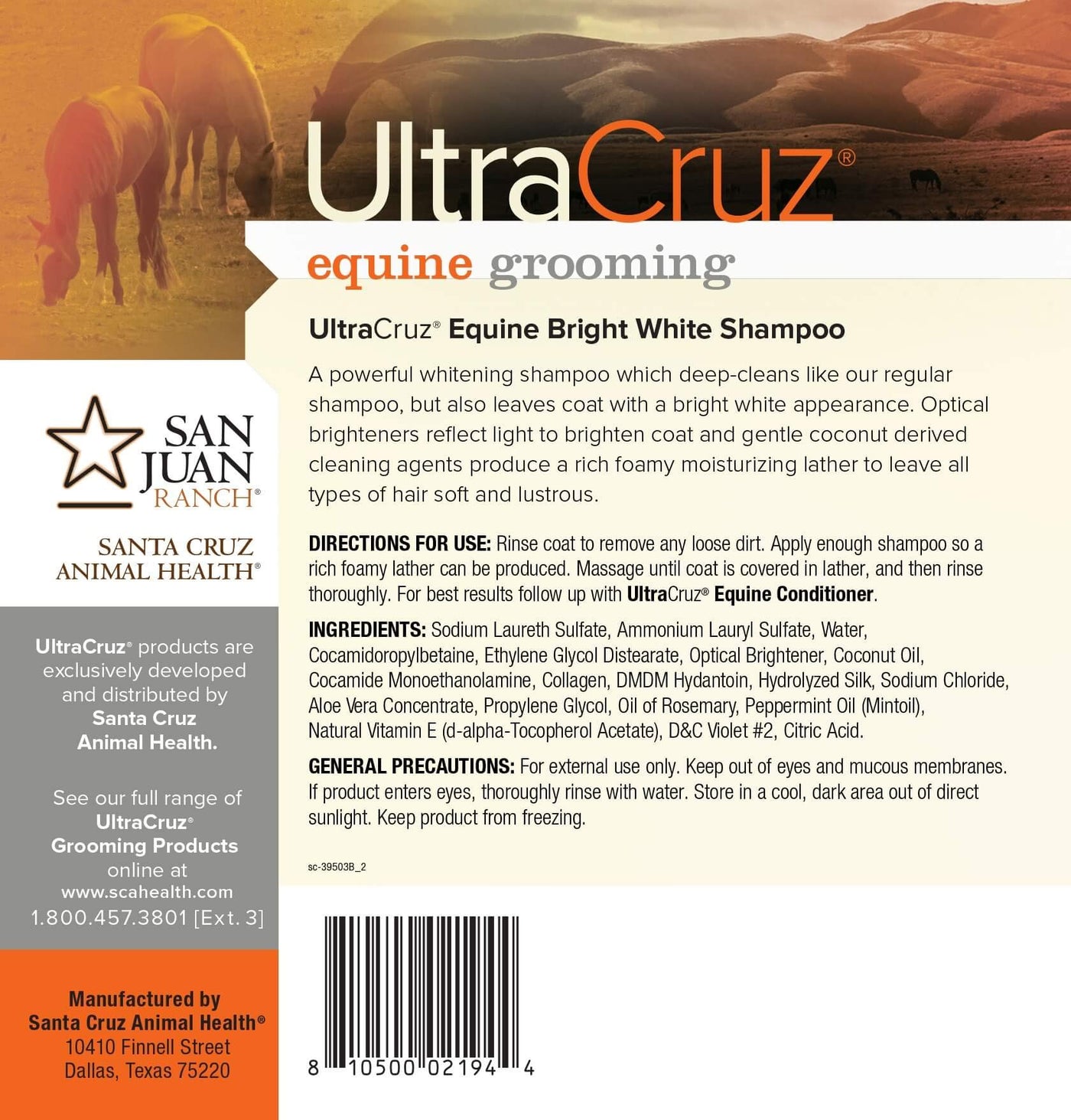 UltraCruz Equine Bright White Shampoo for Horses is a deep cleaning, whitening and color-enhancing shampoo that leaves the mane, tail and coat with a healthy glow. UltraCruz Equine Bright White Shampoo for Horses does not contain bleach and may safely be used on horses of all coat colors. It is perfect for use on existing white markings to leave blazes, stripes, dapples, stockings, tails and more with a radiant white appearance, and may help brighten the overall hair coat. UltraCruz Equine Bright White Shampoo for Horses gently whitens while naturally conditioning hair to leave hair soft, healthy and shiny. Carefully selected cleaning agents derived from coconut work together with optical brighteners to remove stains and brighten white hair coats without causing damage to the skin or coat.