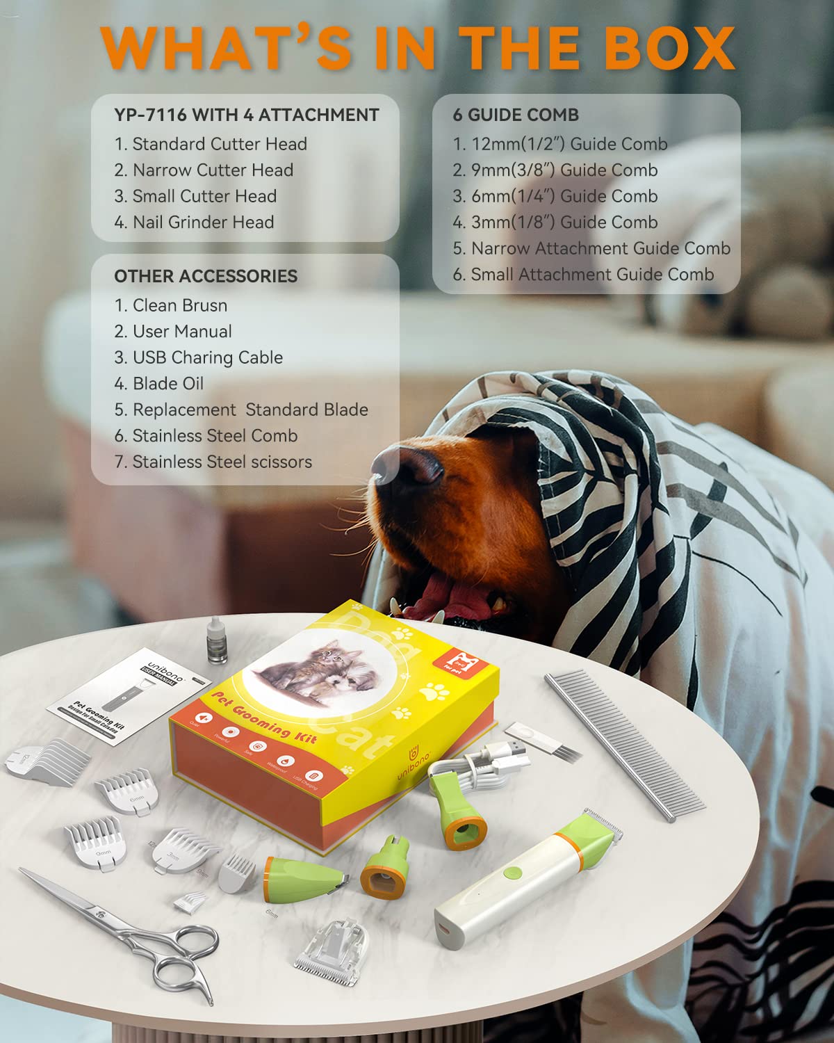 Package includes: 7116 pet hair clipper x 1 Narrow attachment x 1 Small(details) attachment x 1 Nail grinder attachment x 1 Standard blade x 1 3mm guide comb x 1 6mm guide comb x 1 9mm guide comb x 1 12mm guide comb x 1 Narrow attachment guide comb x 1 Small attachment guide comb x 1 USB charging cable x 1(adapter not included) Clean brush x 1 User manual x 1 For Labrador Retrieve French Bulldog Golden Retriever German Shepherd Standard Poodle Bulldog Beagle rottweiler German Shorthaired Pointer Dachshund Pomeranian Sphinx American Shorthair Siamese cat Persian cat Lynx rufus Maine Coon Ragdoll Oriental shorthair American curl Bengal cat maquina para cortar pelo de perros cortadora de pelo para perros maquina para cortar pelo de perros maquina de cortar pelo para perros