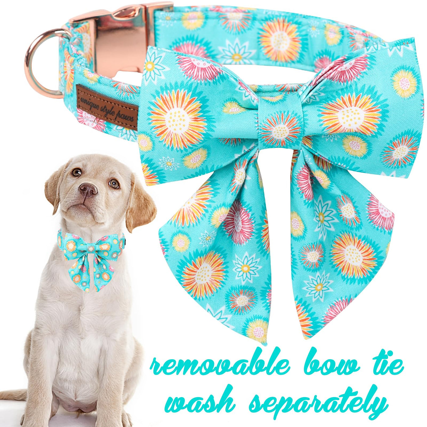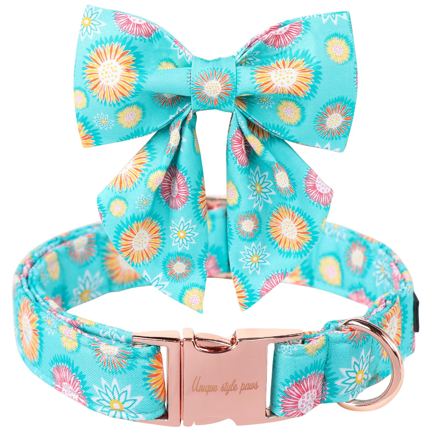 Q: What makes the Unique Style Paws Blue Dog Collar different from other collars?A: The Unique Style Paws Blue Dog Collar stands out due to its fashionable design with a vibrant sunflower pattern, sturdy metal buckles for durability, and its adjustable size feature, ensuring comfort for dogs of all sizes.