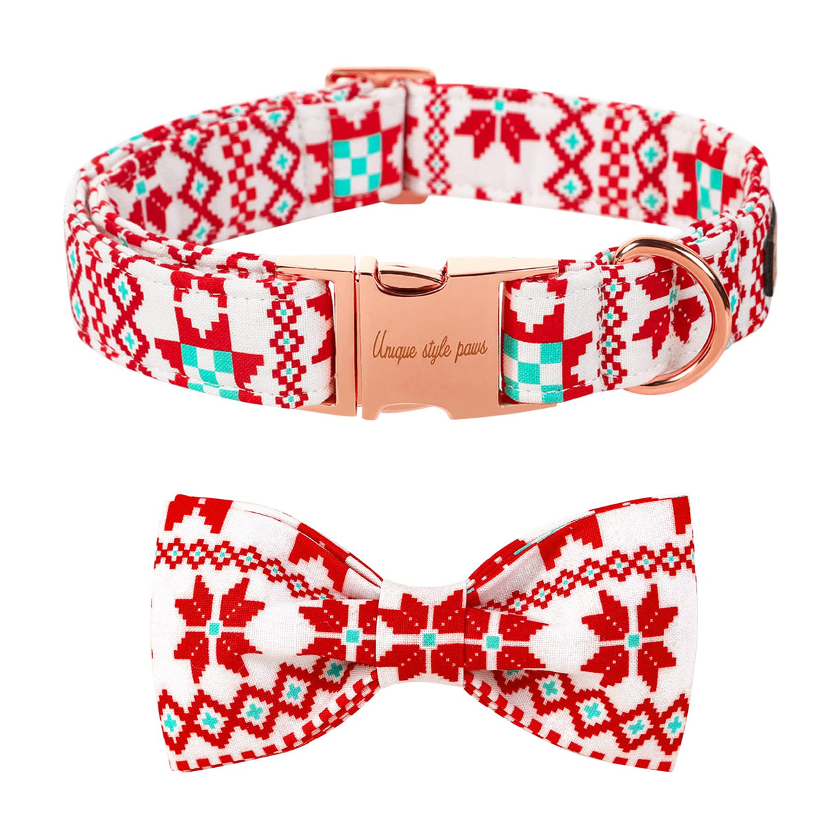 Q: Is the bow tie detachable from the collar?A: Yes, the bow tie on the Unique Style Paws Christmas Dog Collar is removable. It features two elastic bands, allowing you to easily attach it or switch it with another collar for a customized look.