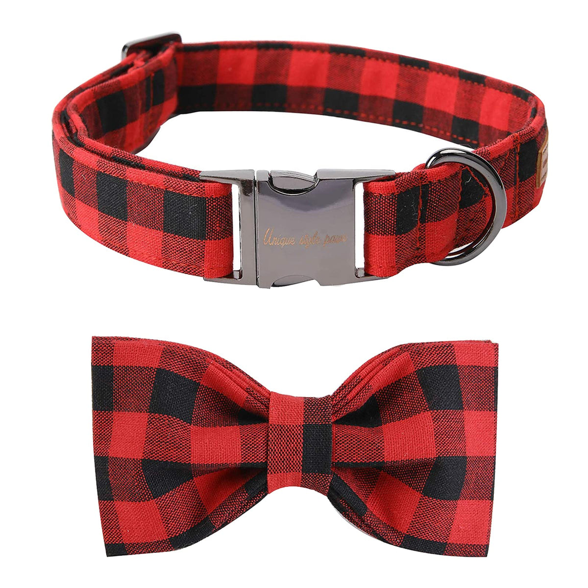 Unique Style Paws is a brand that people love with different colors and durable buckles collar is made with multiple layers of designer cotton fabric We use all of our products on our own pet family members and we do stand by the quality of our collars Because pets are members of our family and we have to consider the fur baby safety Although my handmade products are strong but no collars or leashes are indestructible For your pets safety we suggest regularly checking your collar for signs of wear Do not recommend these for pups that pull a lot or chasers heavy-duty daily use Size: XXS-collar length: 7-11 width: 38 Bow: 175 x 325 XS-collar length: 8-12 width: 58 Bow: 175 x 325 S-collar length: 10-16 width: 45 Bow: 2x 4 M-collar length: 135-22 width: 1 Bow: 228 x 48 L-collar length: 16-24 width:12 Bow: 275 x 52 XL-collar length: 16-26 width: 15 Bow: 275 x 52 The guidelines above are just general sizing recommendations Every dog is different in size and weight Before purchasing measure your pups neck circumference while he or she is sitting Please make sure the measuring tape is not pulled too tight or left too loose and is held where your pups collar usually sits abric:Each collar is made with pure cotton designer fabric ackage quantity:One collar and one bow Occasion: Our collars have a variety of styles suitable for HOLIDAY pet party family picnic and other different occasions Service:We provide After-Sales and answer every customers questions we are committed to providing the best service to each customer