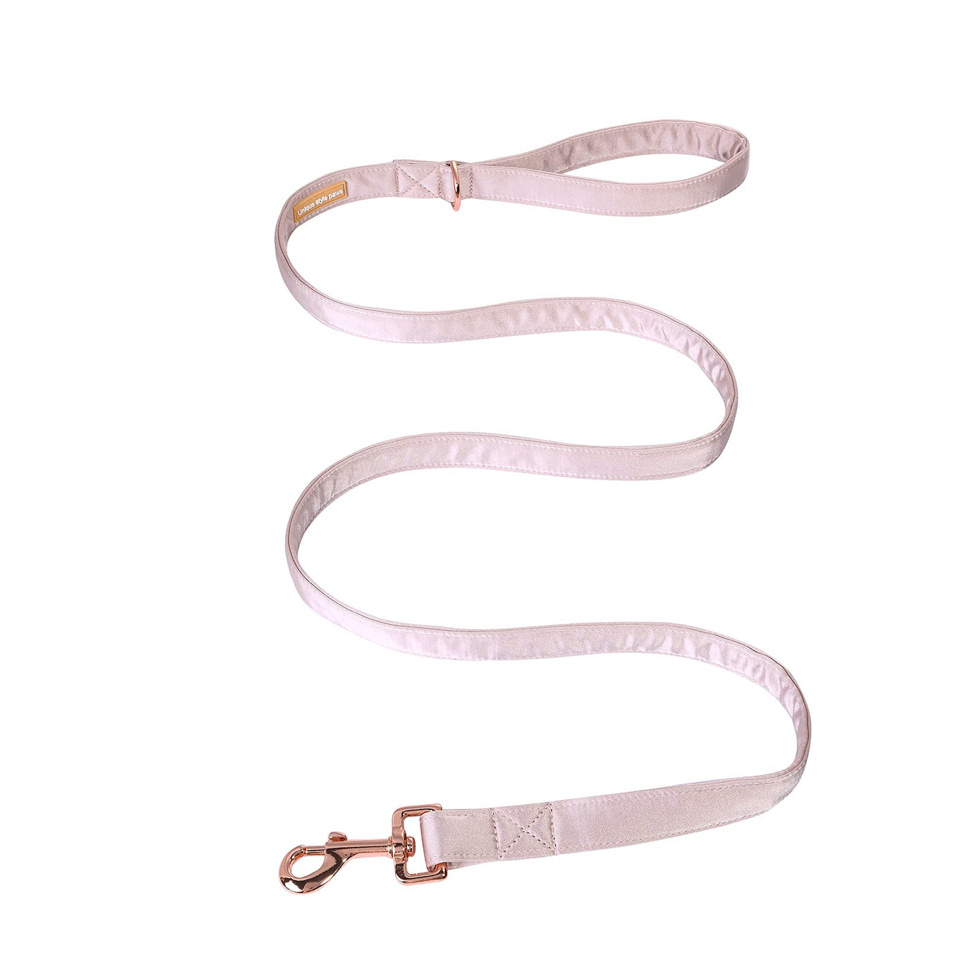 Q: What materials are used in the construction of the leash?A: The leash is crafted from high-quality silk combined with durable hardware, ensuring both style and strength. It features a heavy-duty metal clasp and a D-ring near the handle for attaching accessories.