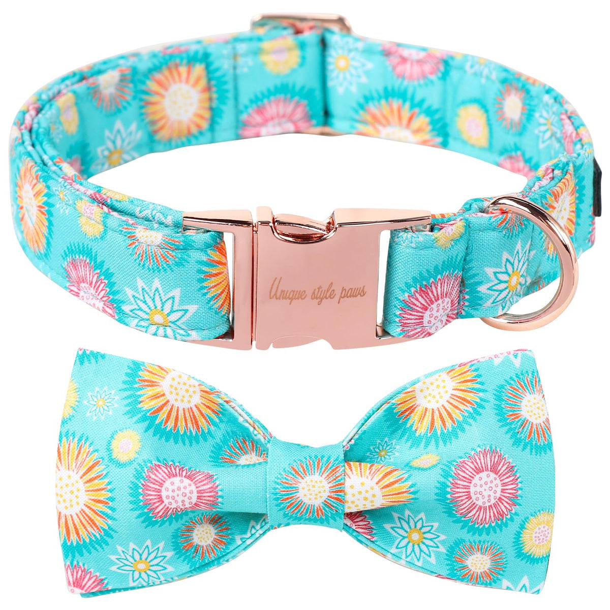 Q: What makes this collar different from other dog collars?A: This collar stands out due to its unique design featuring a colorful sunflower pattern and a stylish bow tie, along with durable metal buckles that offer greater reliability compared to standard plastic buckles.