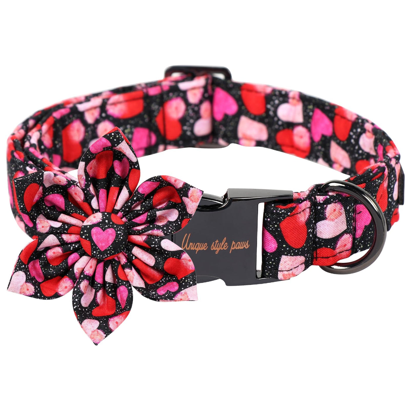 Q: What sizes does the Unique Style Paws Valentine's Dog Collar come in?A: The Unique Style Paws Valentine's Dog Collar is adjustable and designed to fit small, medium, and large dogs. This ensures that you can find the perfect fit for your furry friend, regardless of their neck circumference.
