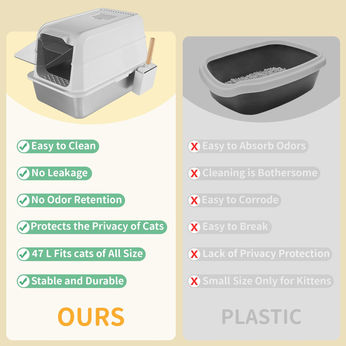 Covered Stainless Steel Litter Box With Lid, Xl Extra Large Cat Litter Box , Enclosed Metal Litter Pan With High Sided Enclosure & Scoop, Anti Leakage, Easy To Clean, Odor Control