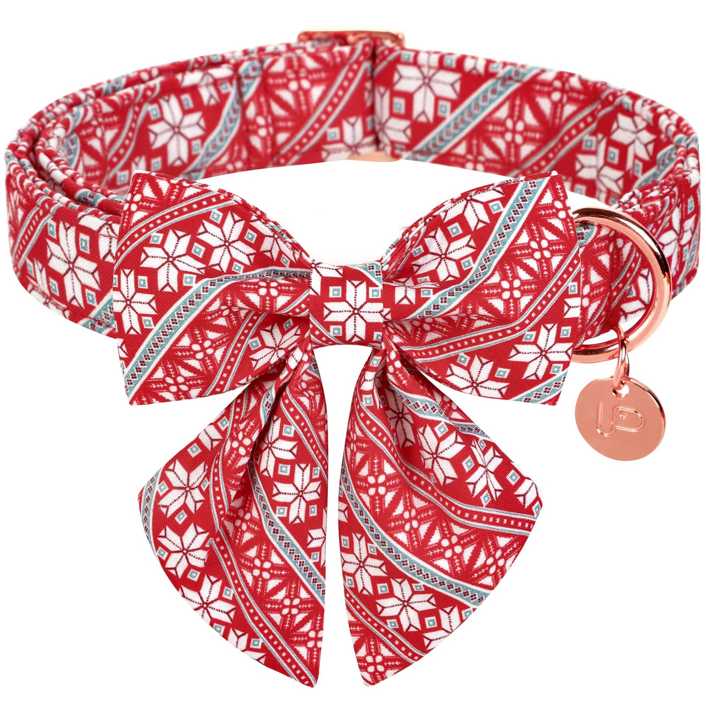 Q: Is the bow tie detachable on the Christmas Dog Collar?A: Yes, the bow tie on the UP URARA PUP Christmas Dog Collar is detachable. It is designed with elastic loops that allow for easy removal and attachment, making it convenient for changing up your pet's look.