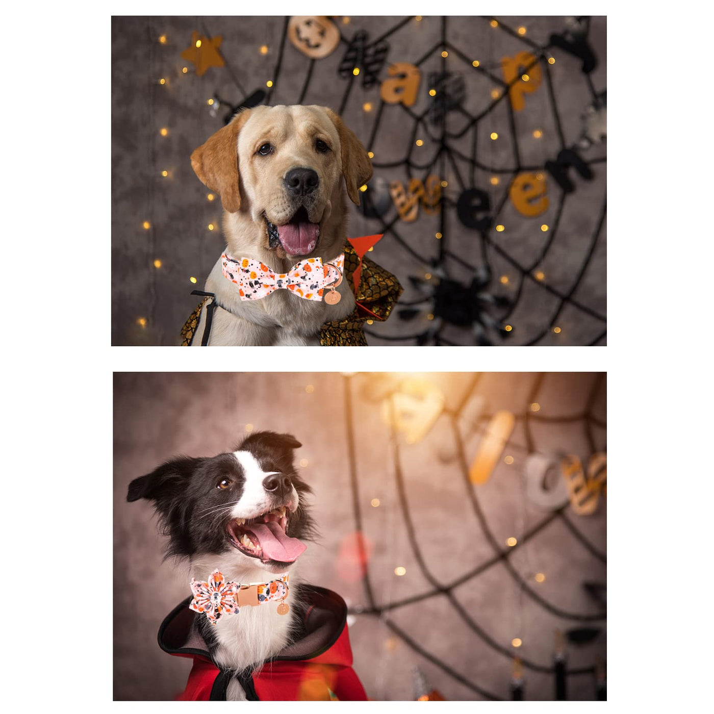 Halloween Dog Collar: Halloween dog bow tie/flower collar with pumpkin spider skull pattern. Halloween collar is suitable for your puppies. A typical Halloween gift representative that spreads holiday atmosphere.