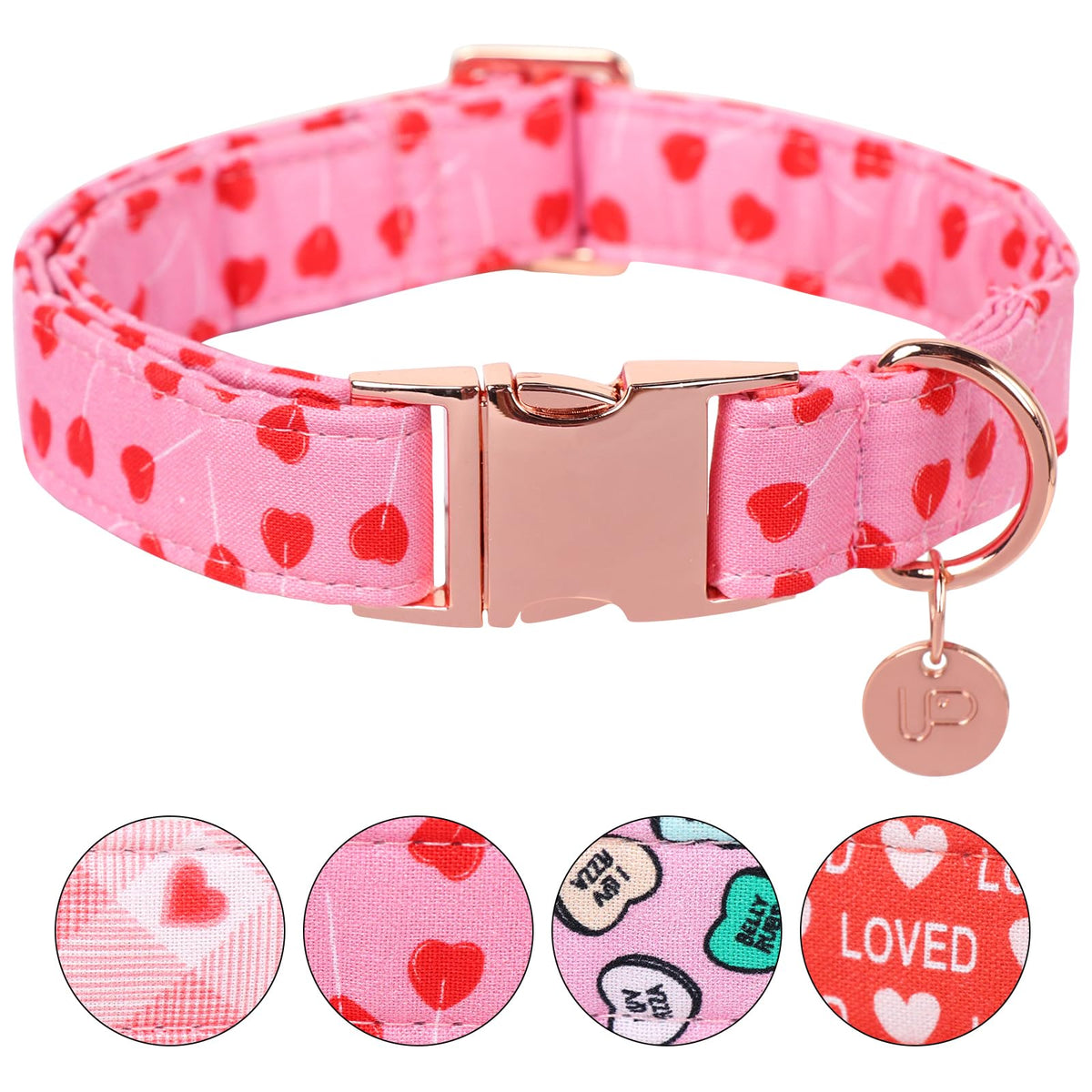 Up Urara Pup Valentine'S Dog Collar, Pink Heart Pattern, Adjustable Size (10-16 Inches), Premium Cotton, Sturdy Metal Buckle, Pe