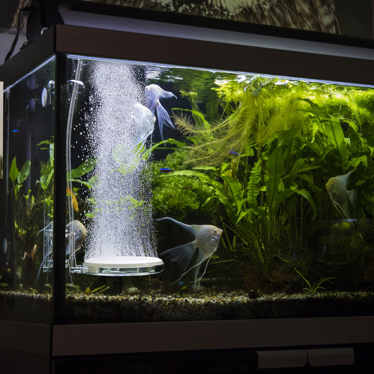 We suggest cleaning the disc once a month. Don’t put it under aquarium light to avoid moss.
