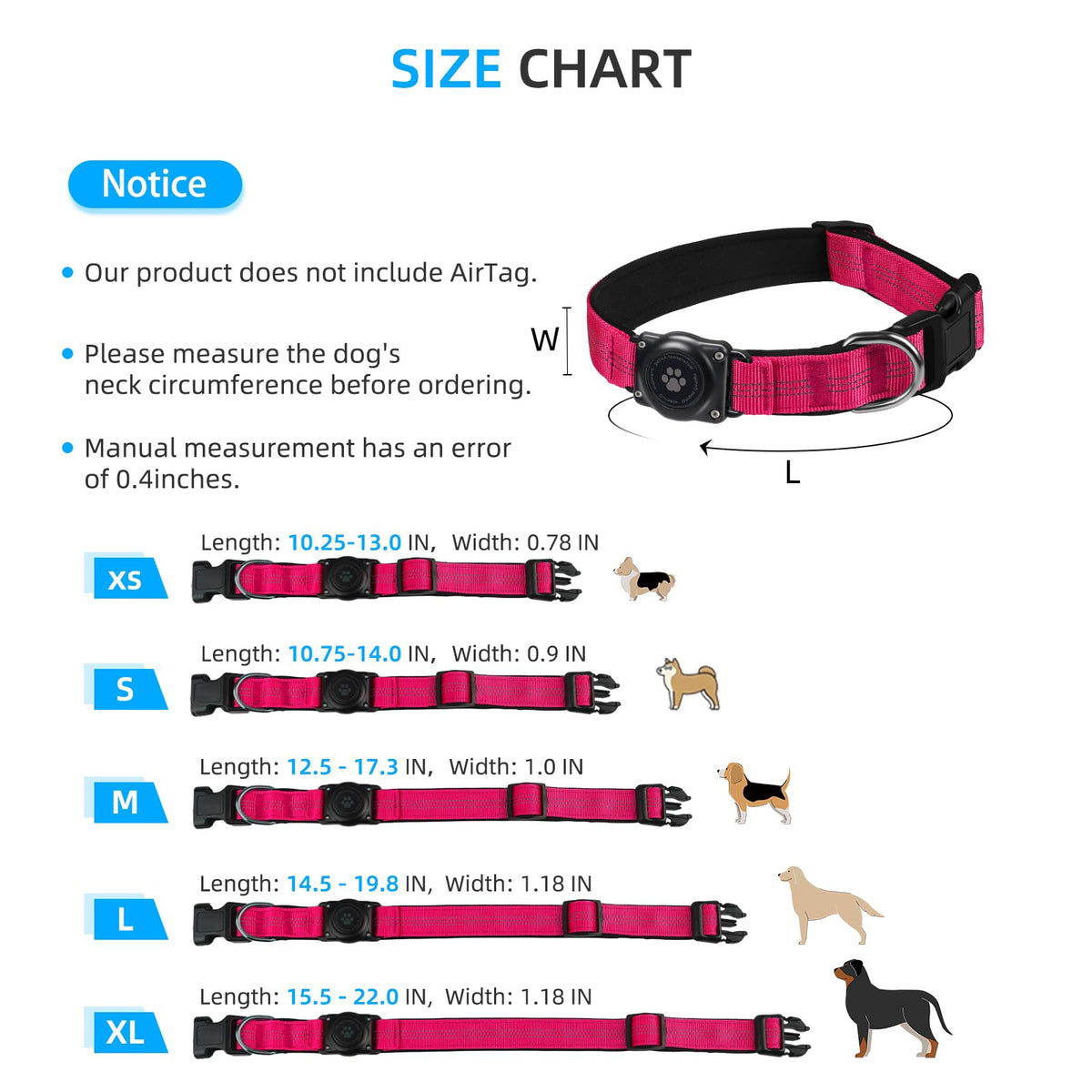 Wide Range of Sizes: Adjustable AirTag collar is available in 4 sizes. (S=10.75-14'' M=12.5-17.3'' L=14.5-19.8'' XL=15.5-22'') Please measure the circumference of your puppy's neck before purchasing. Package contains: 1* Apple Air Tag dog collar 1* screwdriver (AirTag is NOT INCLUDED)