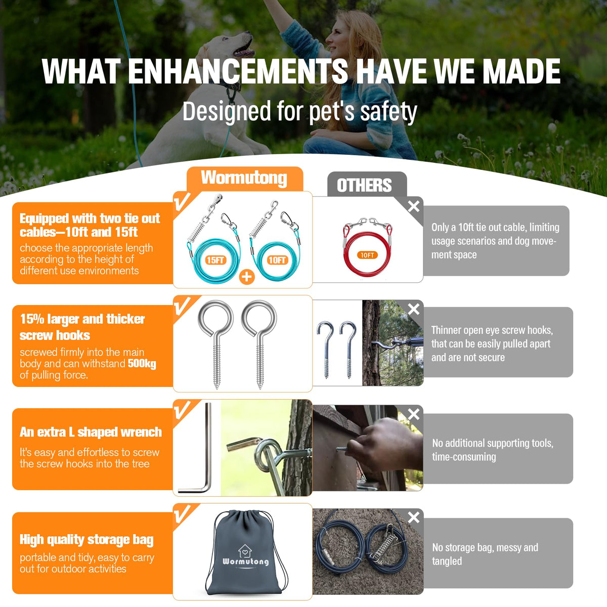 Introducing Our Upgraded Dog Runner For Your Yard - The Perfect Outdoor Dog Lead For Large Dogs Up To 250Lbs! Our Heavy-Duty Dog Trolley System Comes With A 200Ft Long Lead Cable And 2 Tie Out Cables Of 10Ft And 15Ft, Providing Ample Space For Your Furry Friend To Run And Play In The Backyard, At The Park, Or While Camping. This Reinforced And Durable Long Dog Leash Cable Is Designed To Is To Keep Runner Dogs Safe, Ensuring That They Are Securely Restrained And Unable To Escape, Ensuring The Safety And Comfort Of Your Pet. Our Long Dog Lead Is Made From Stainless Steel Wire That Is Chew-Resistant And Rust-Proof, Making It Perfect For Long-Term Use. The Pvc Coating Protects The Cable From Abrasion And Fading, Adding To Its Longevity. This Dog Zlip Line Aerial Run Is Easy To Set Up And Can Be Installed Between Two Sturdy Trees Or Posts. Take Your Furry Friend Along On Your Outdoor Adventures With Our Dog Trolley System. Make Your Dog Feel Free To Run While Sustaining Its Safety And Comfort With Our Outside Heavy Duty Long Dog Run Cable.